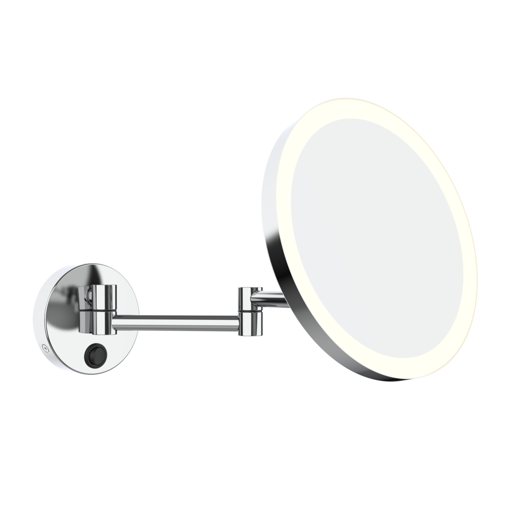 Visuelle Spannung entsteht durch asymmetrische Synergie: der rechteckige Spiegelarm verbindet das runde Acrylgehäuse mit einem markanten runden Sockel. Ungewöhnliche Formensprache für eine ergonomisch intuitive Lösung; die mattierte Acrylabdeckung auf der Rückseite des Spiegels ermöglicht ein Hintergrundlicht für eine warme, personalisierte Präsentation.