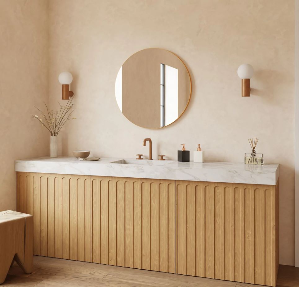 Der runde Spiegel ORE bringt moderne Eleganz in das Badezimmer. Sein filigraner, goldfarbener Rahmen aus gebürstetem Aluminium setzt hochwertige Akzente und verleiht dem Spiegel eine edle und zeitlose Ausstrahlung. Ob als stilvoller Mittelpunkt über dem Waschtisch oder als dekoratives Highlight an einer freien Wand – dieser Spiegel bringt Harmonie und Leichtigkeit in jeden Raum.