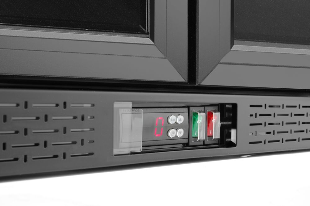 Geräumiger Barkühlschrank mit Türen aus gehärtetem Glas. Ausgestattet mit LED-Beleuchtung zur Präsentation von Produkten.