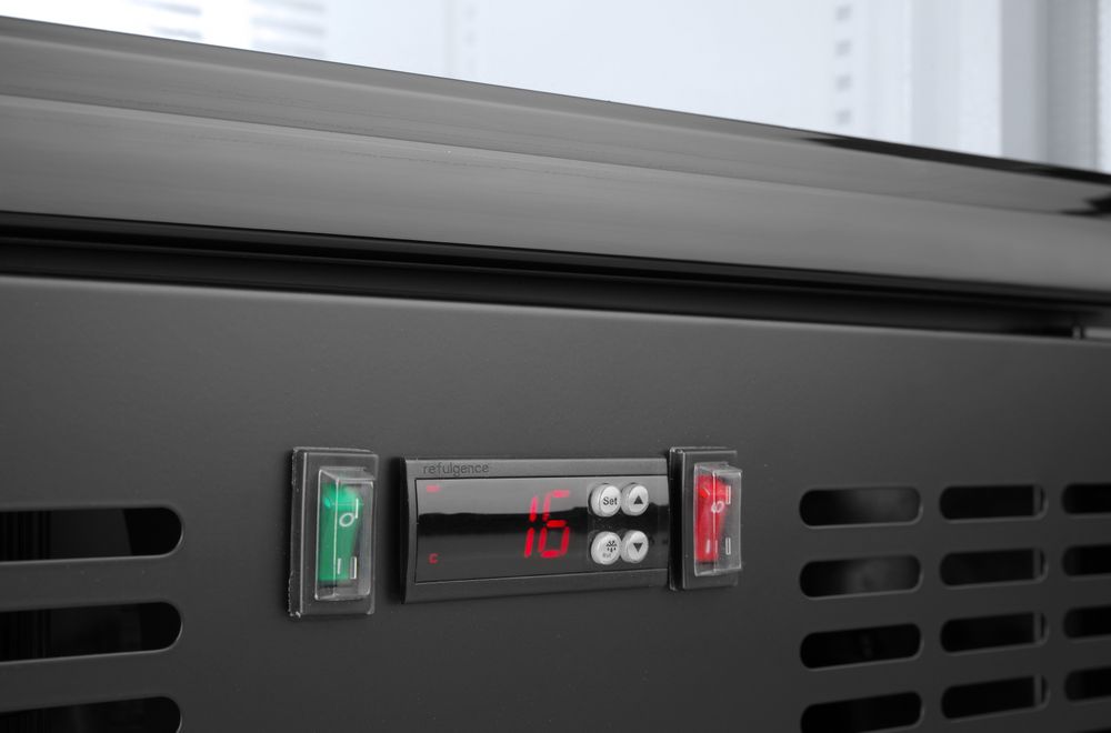 Geräumiger Bar-Kühlschrank mit gehärteter Glastür. Ausgestattet mit LED-Beleuchtung zur Präsentation von Produkten.