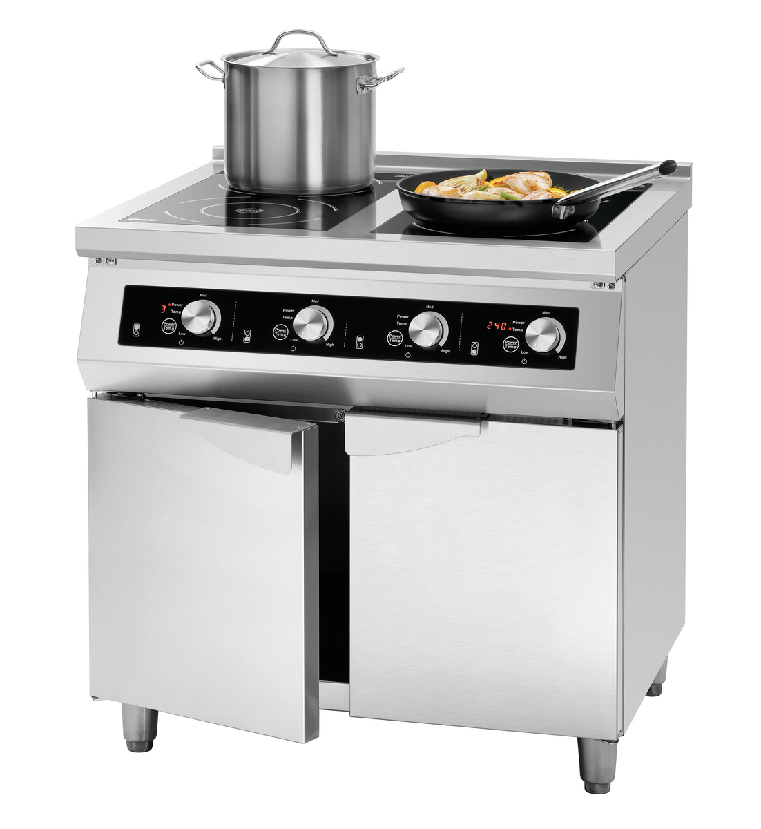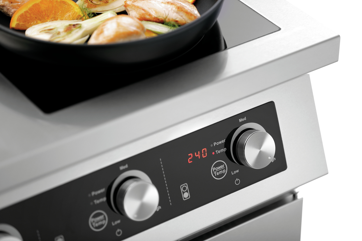 Mit dem 4-Felder Induktionsherd GU hat man einen leistungsstarken und zuverlässigen Partner in der Küche. Das geteilte Glaskochfeld bietet großzügigen Platz zum Arbeiten und die 17 kW können entweder über Leistungsstufen oder Temperatur gesteuert werden.