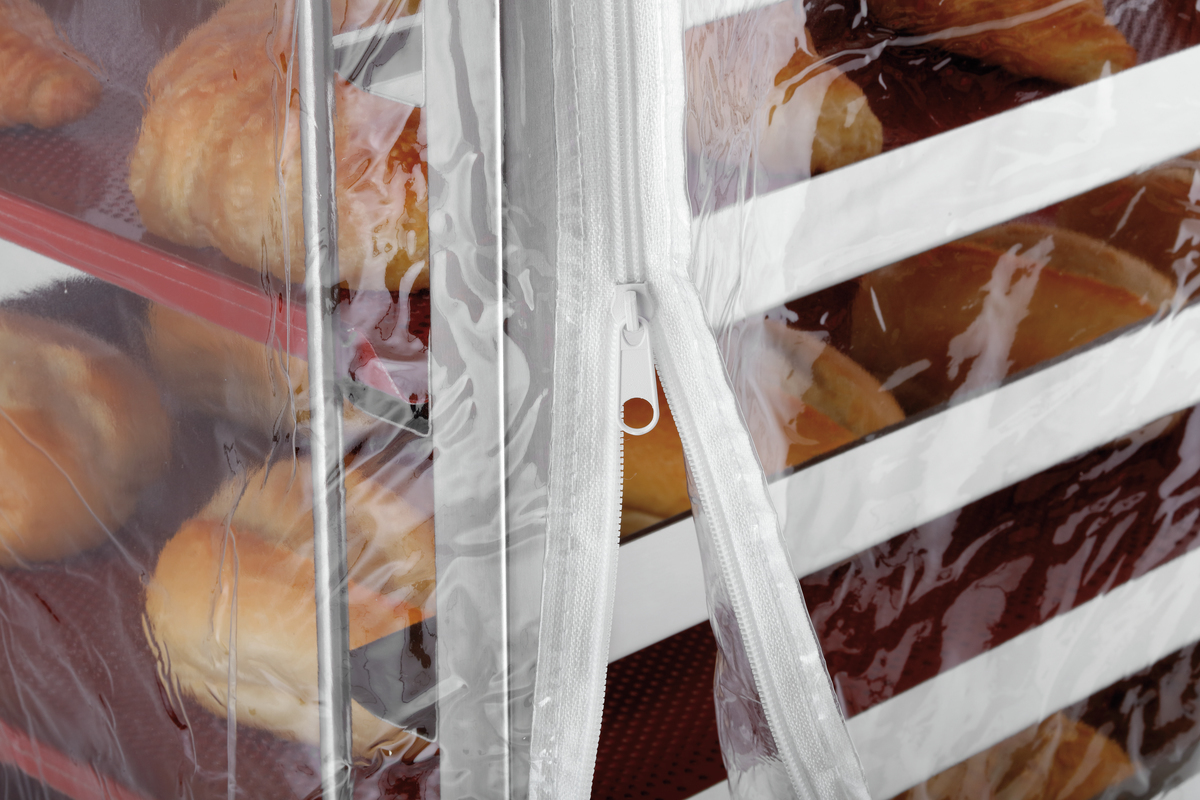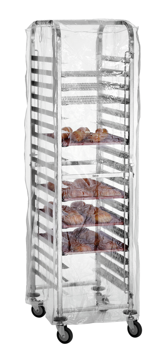 Die transparente Abdeckhaube schützt bei Transport und Lagerung vor Staub und Unreinheiten - sogar in Kühlräumen. Die Reißverschlüsse ermöglichen ein unkompliziertes Bestücken des Wagens auch mit aufgezogener Haube.