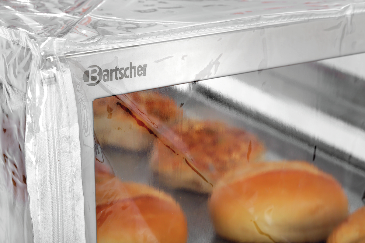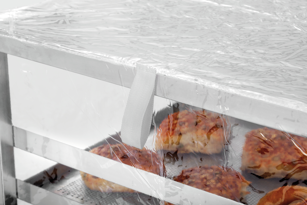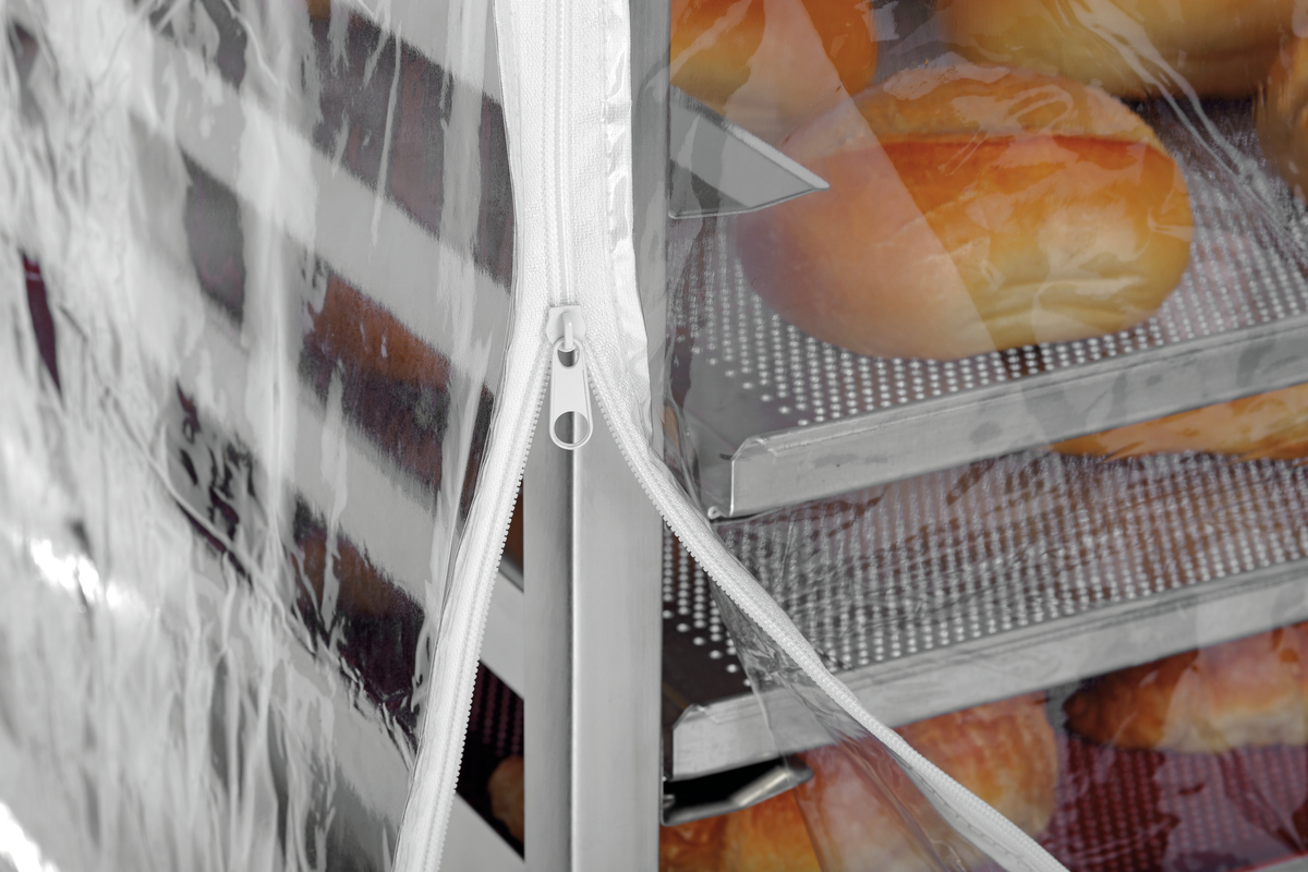 Die transparente Abdeckhaube schützt bei Transport und Lagerung vor Staub und Unreinheiten - sogar in Kühlräumen. Die Reißverschlüsse ermöglichen ein unkompliziertes Bestücken des Wagens auch mit aufgezogener Haube.