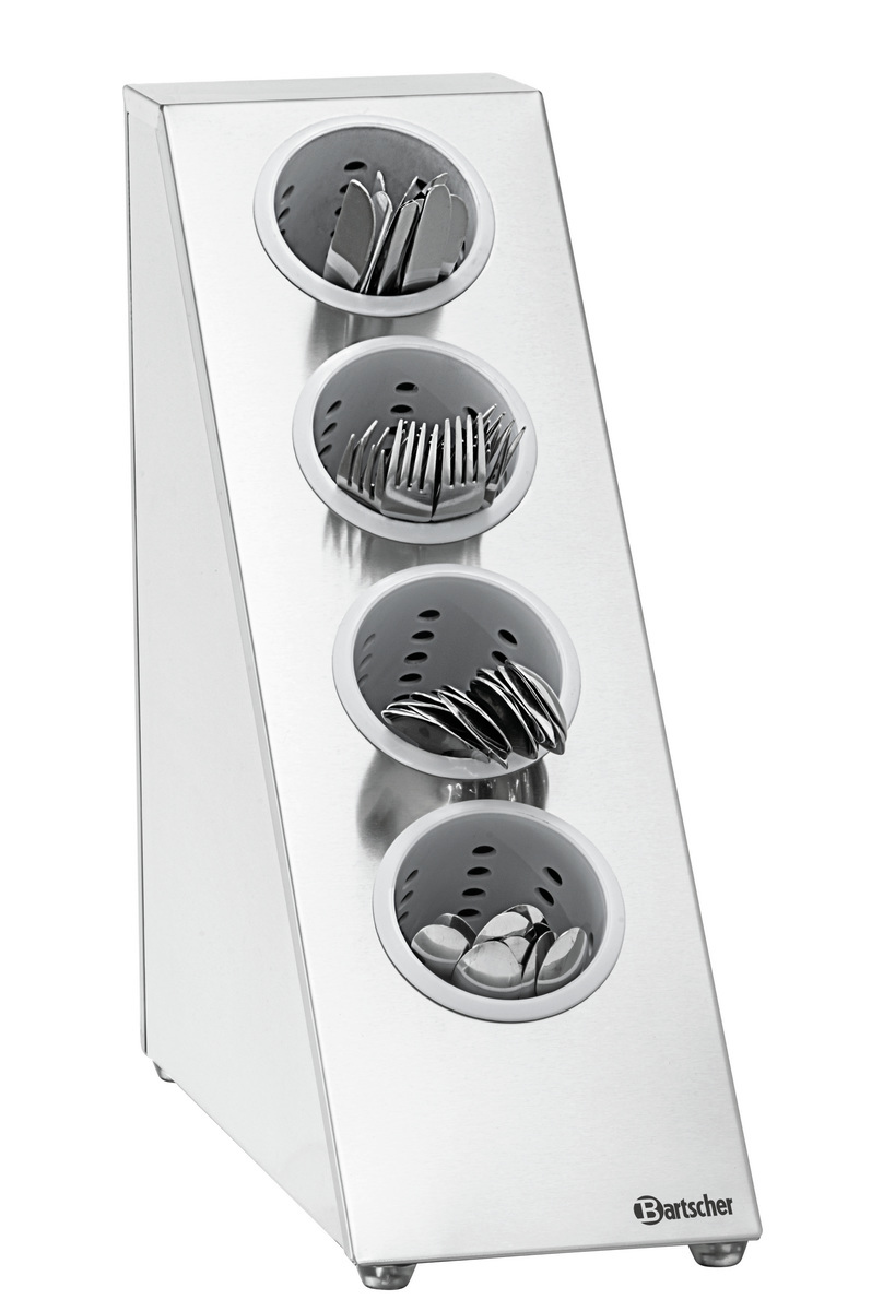 In Kantinen, bei Buffets und im Self-Service-Bereich findet der Besteckbehälter seinen Platz. Die Materialbeschaffenheit und ebenso die Möglichkeit die optional erhältlichen Besteckköcher herausnehmen zu können sind die besten Voraussetzungen für eine hygienisch einwandfreie Reinigung.