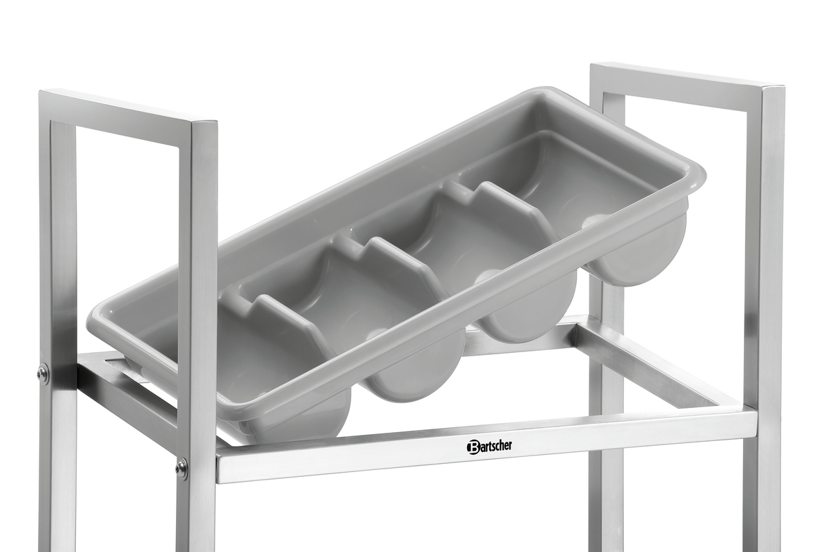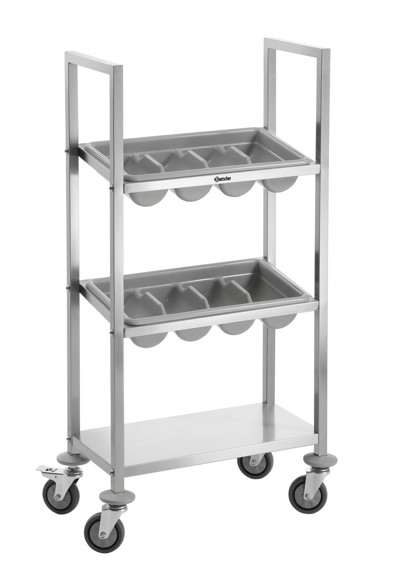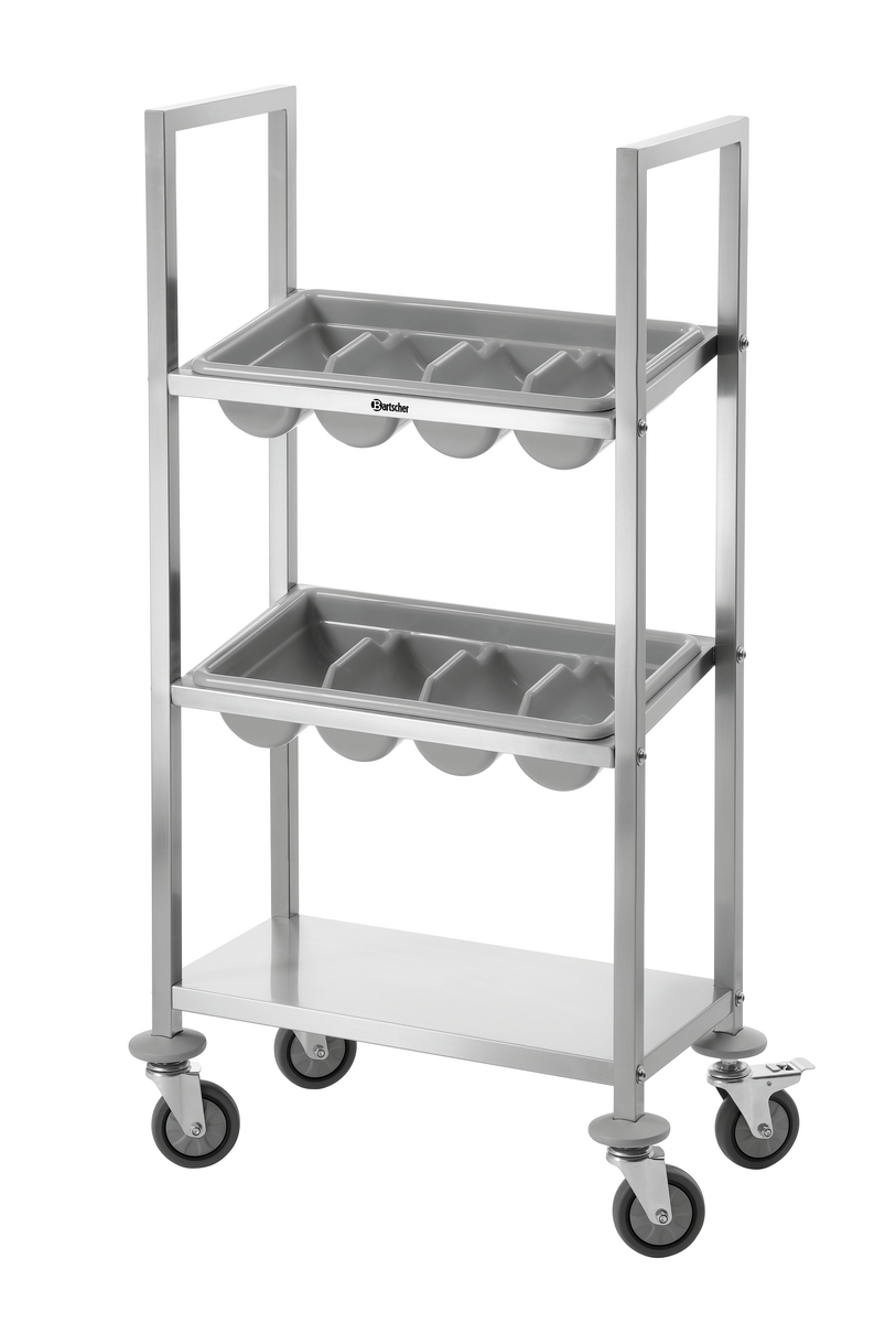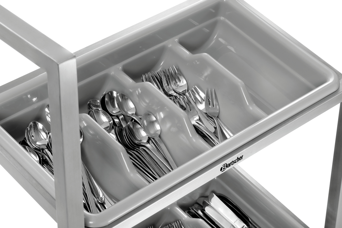 Ob in der Küche oder im Service - Der Besteckwagen erleichtert den Arbeitsablauf in den verschiedensten Bereichen. Platzsparend und gut sortiert in der Lagerung, praktisch und anwender- sowie rückenfreundlich im Servicebereich. Tische können mit dem mobilen Bestecktransport schneller und einfacher eingedeckt und ebenfalls abgeräumt werden.