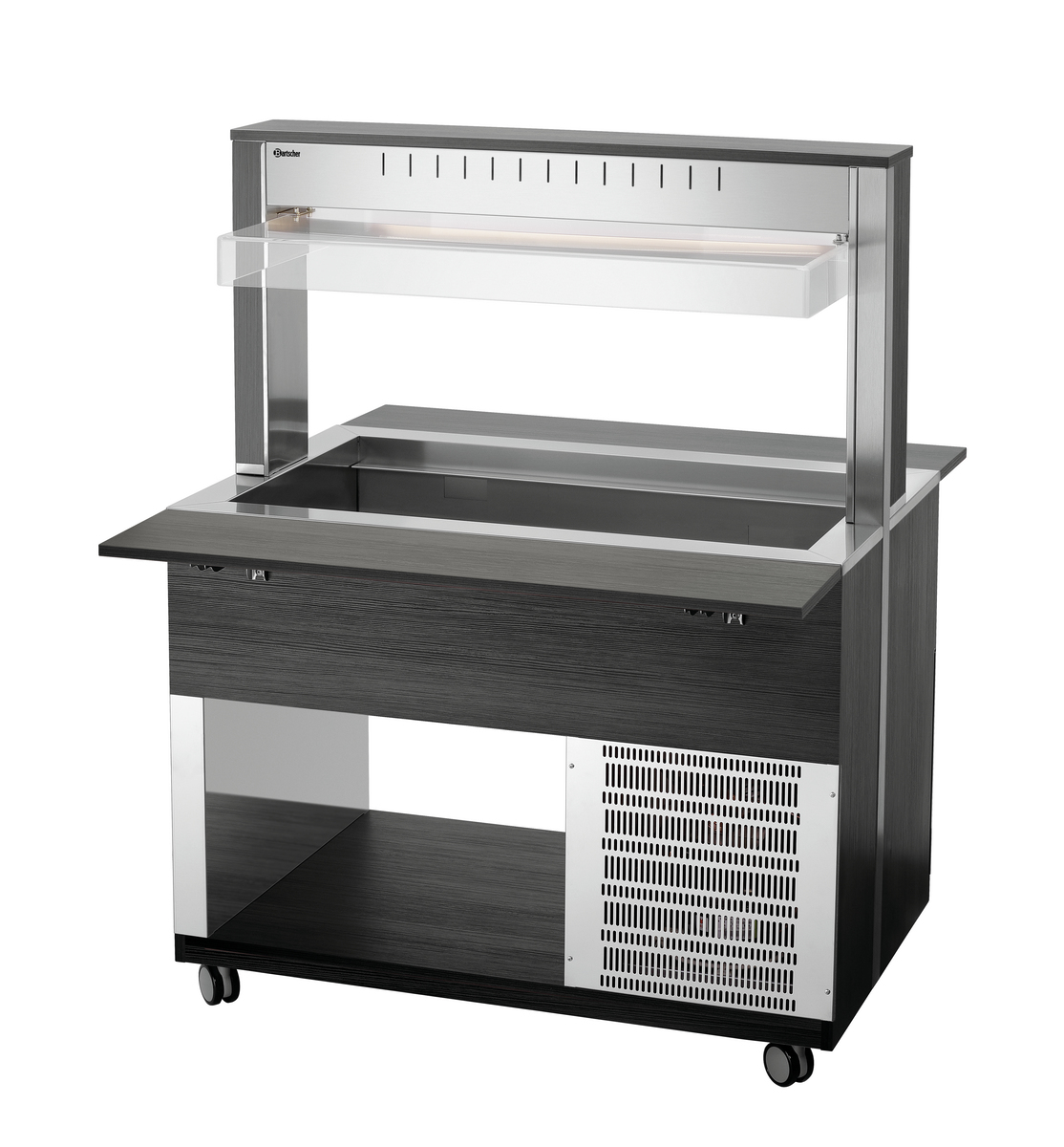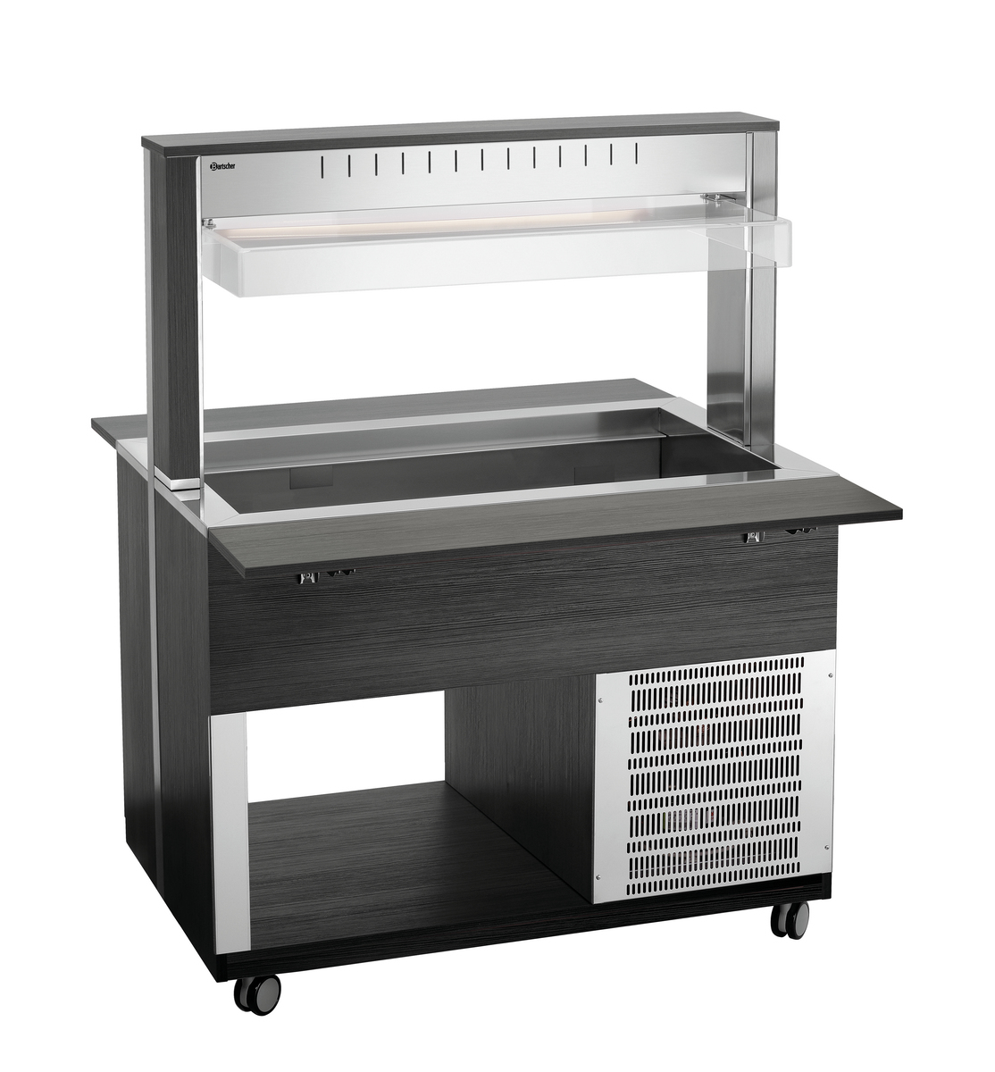 Die mobile Buffetlösung im modernen Holzdesign - Der Buffetwagen mit Hustenschutz und LED-Beleuchtung fasst 3 GN-Behälter 1/1 GN und hält Speisen zuverlässig am Buffet kalt.