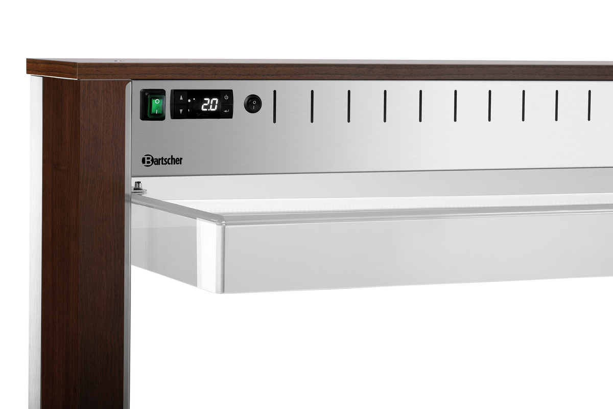 Die mobile Buffetlösung im modernen Holzdesign - Der Buffetwagen mit Hustenschutz und LED-Beleuchtung fasst 3 GN-Behälter 1/1 GN und hält Speisen zuverlässig am Buffet kalt.