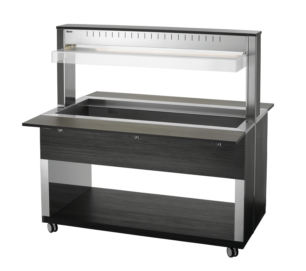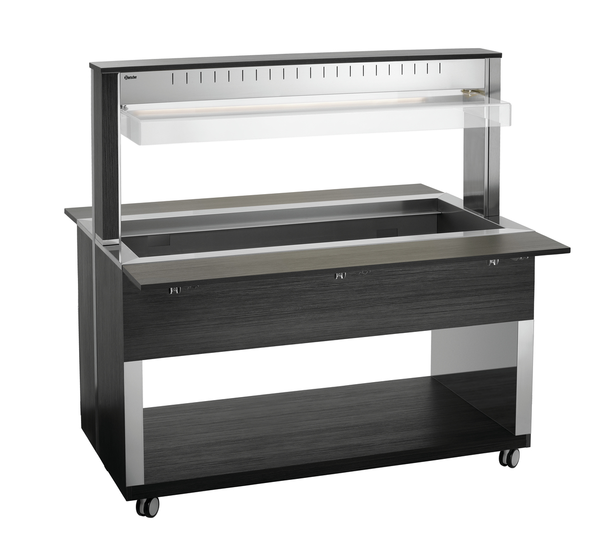 Die mobile Buffetlösung im modernen Holzdesign - Der Buffetwagen mit Hustenschutz und LED-Beleuchtung fasst 4 GN-Behälter 1/1 GN und hält mit dem Wasserbad-Prinzip Speisen schonend und ansprechend am Buffet warm.