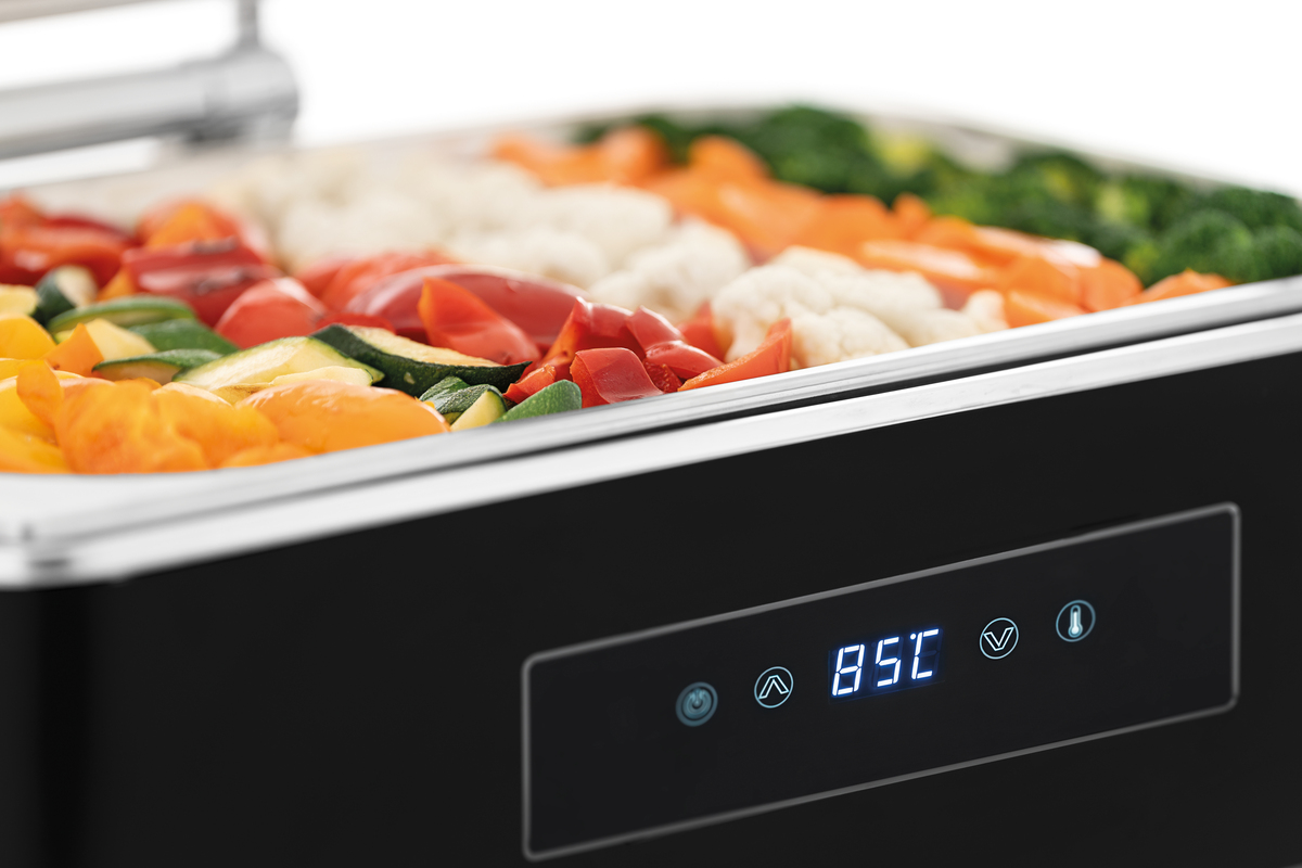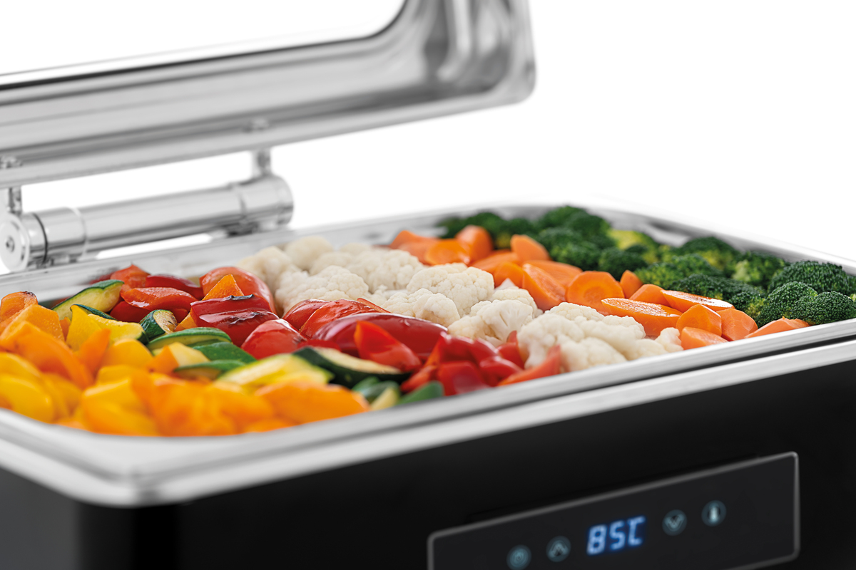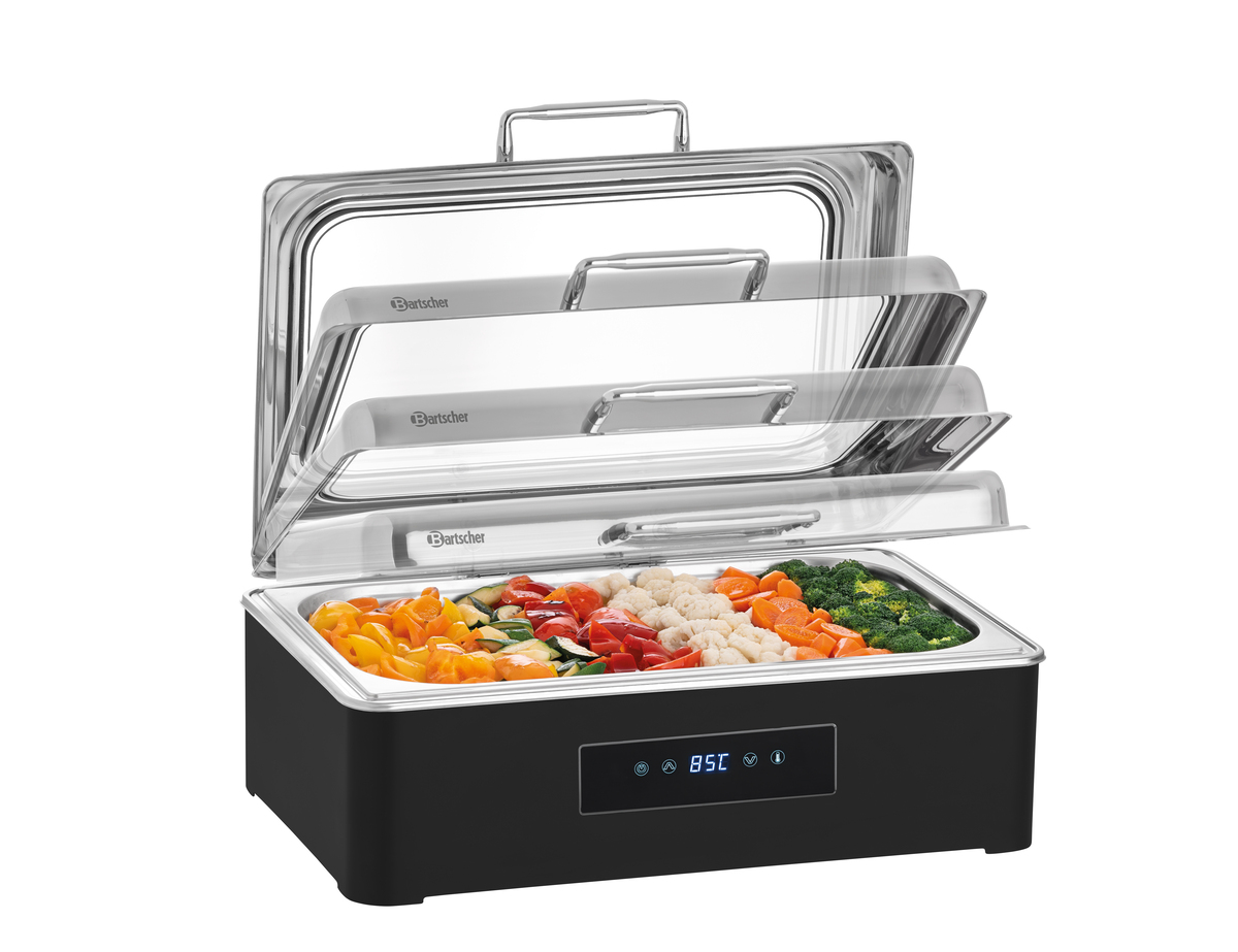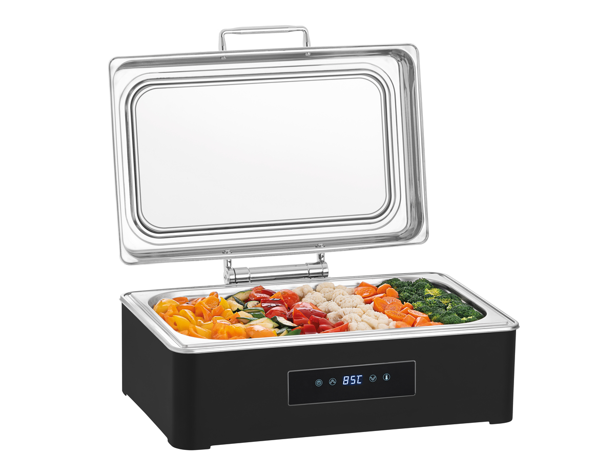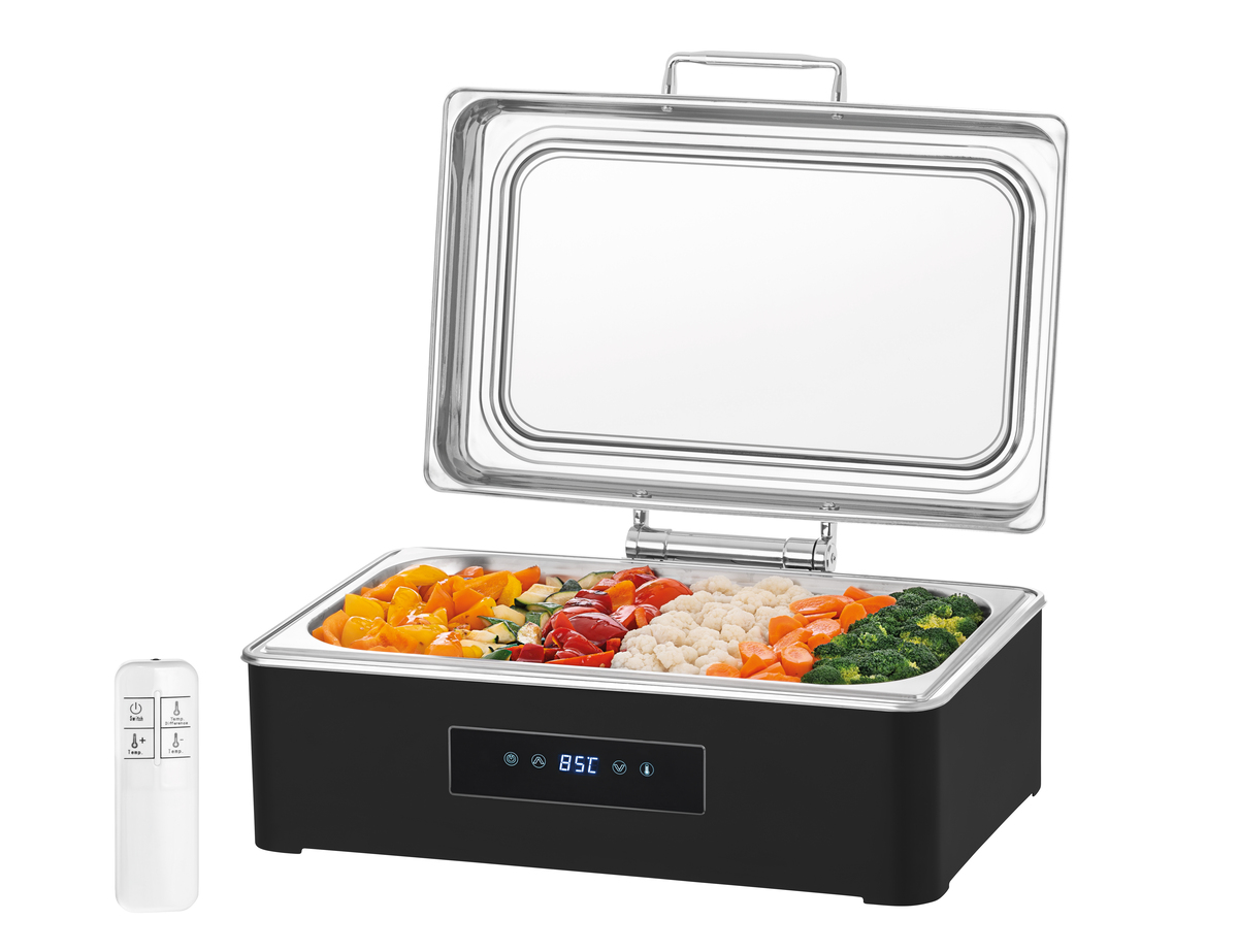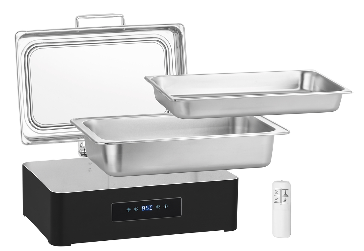 Das stilvolle Chafing-Dish in edlem Schwarz bietet erstklassigen Komfort und Kontrolle - mit intuitiver Touchbedienung und praktischer Fernbedienung wird Catering zum Kinderspiel. Ideal für Selbstbedienungsbereiche, um gastronomische Highlights perfekt zu präsentieren.