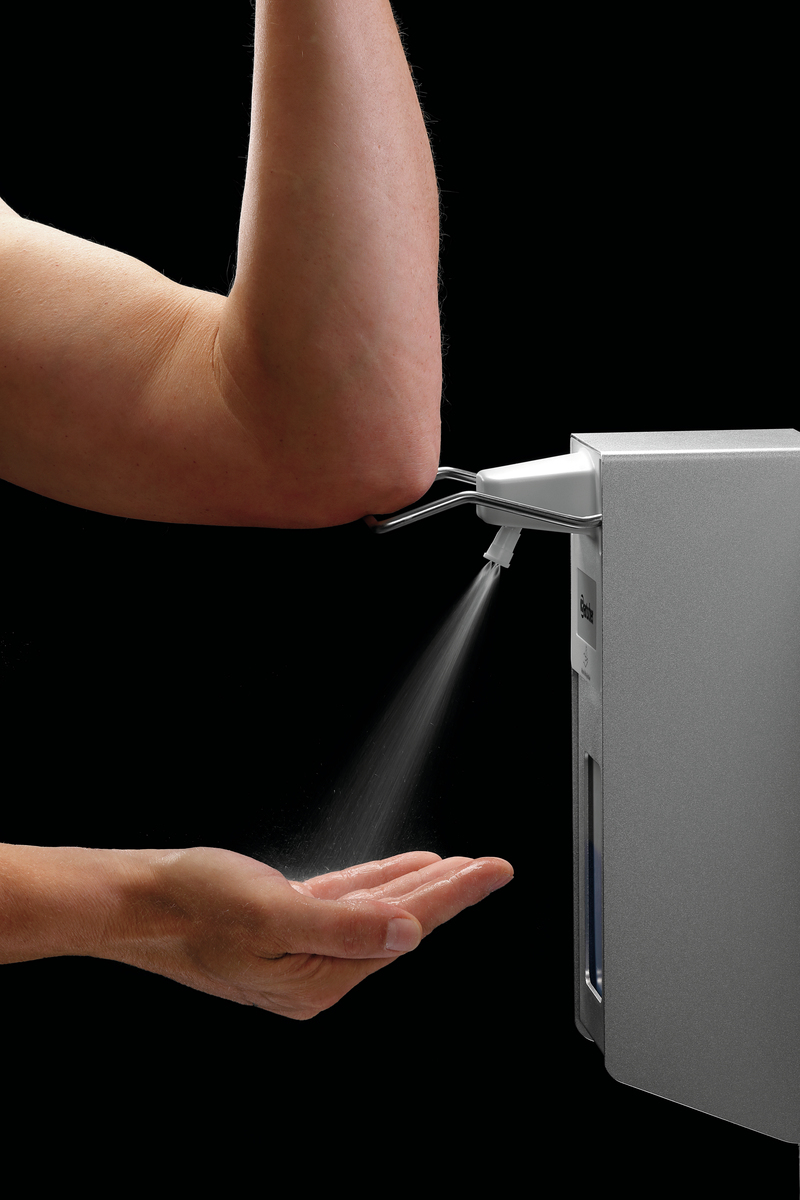 Desinfektionsspender mit praktischer Ellenbogenbedienung für optimale Hygienebedingungen in öffentlichen Gebäuden, Restaurants, Küchen, Laboren, Schulen etc. Das kartuschenlose Pumpsystem sorgt für eine unkomplizierte, umweltfreundliche Befüllung.