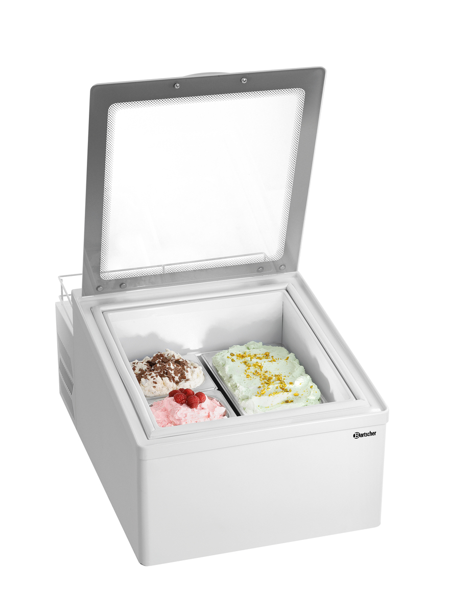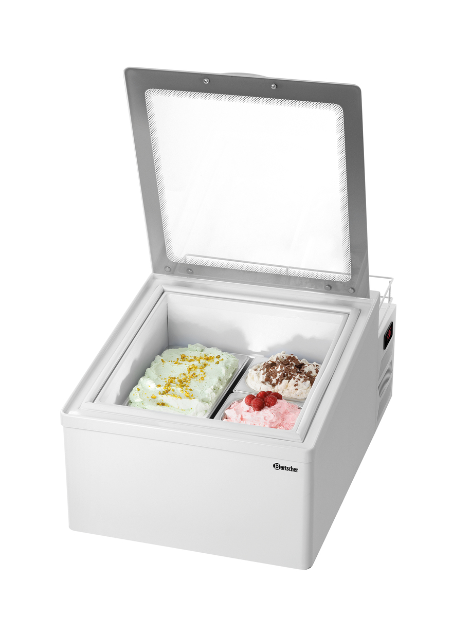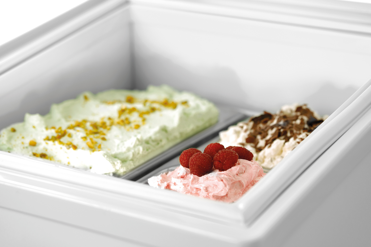 Optimale Aufbewahrung für selbstkreiertes Speiseeis - die Eisvitrine 2x5L-F bietet die Lösung um Desserts nach der Herstellung repräsentativ kühl zu halten. Dank der tiefliegenden Behälter wird das Vereisen der Oberflächen minimiert.