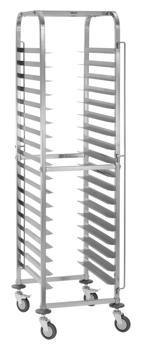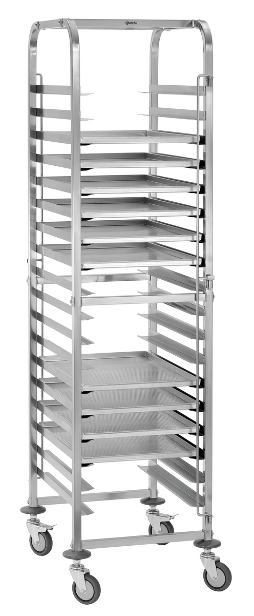 Der Abräumwagen für Bäckereien und Großküchen bietet Platz für 18 Bäckereinorm-Bleche mit einer Größe von 600 x 400 mm. Mit der beidseitigen Behältersicherung ist ein schnelles und sicheres Abräumen garantiert.