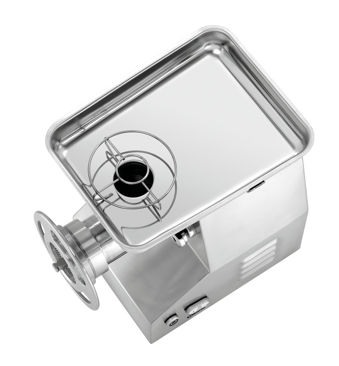 Der Fleischwolf mit extra großem Einfüllschacht und belüftetem Motor schafft bis zu 500 kg pro Stunde. Die abnehmbare Zerkleinerungseinheit ermöglicht eine HACCP-konforme Zwischenlagerung im Kühlschrank.