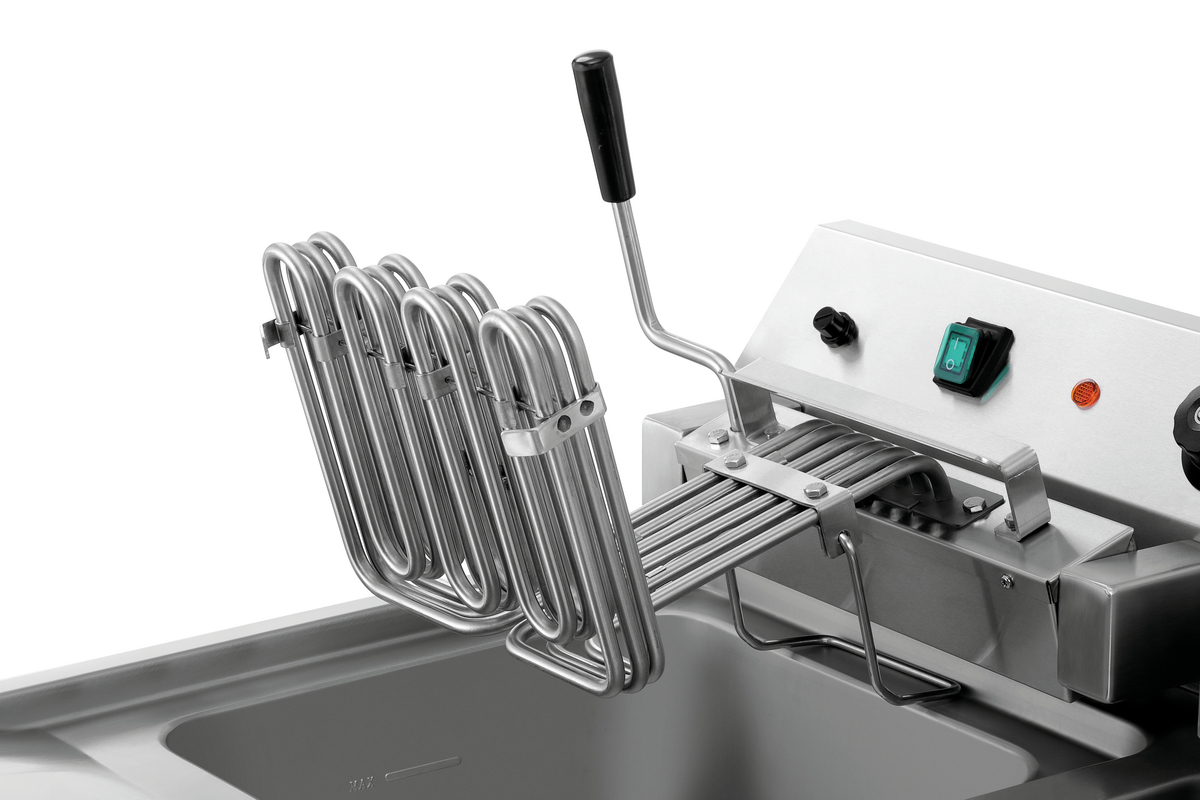 Als robustes Auftischgerät ist die Fritteuse mit den beiden 12-Liter-Becken insbesondere für den Einsatz in der professionellen Großküche ausgelegt. Die Fettablasshähne, die herausnehmbaren Panadensiebe und die herausschwenkbaren Heizelemente ermöglichen eine einfache Reinigung.