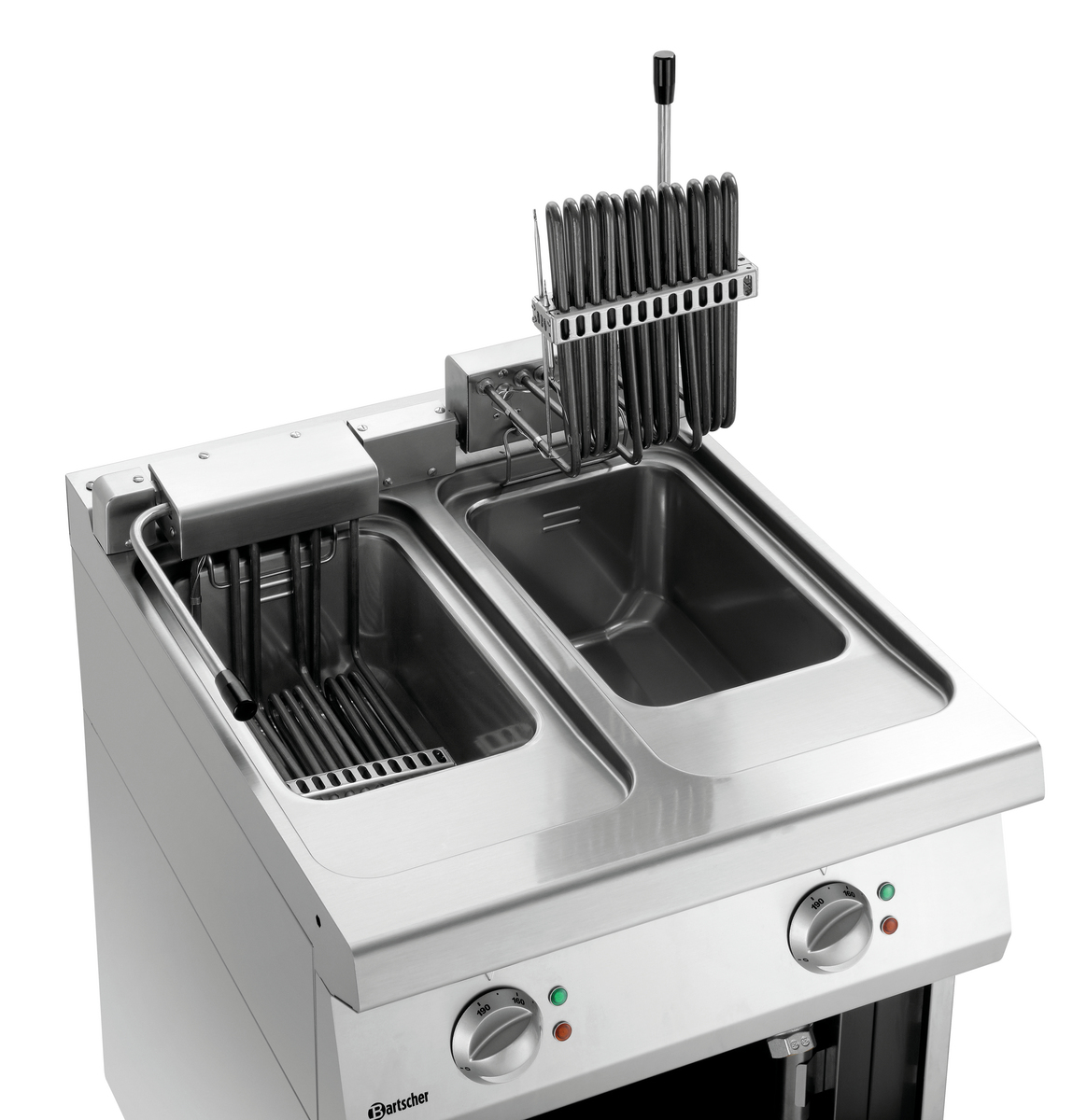 Große Kapazität bei geringem Platzbedarf - Serie 700 mit einer Geräte-Breite von 600 mm. Die beiden 11-Liter-Becken der Elektro-Fritteuse lassen sich dank des herausschwenkbarem Heizelements und der abgerundeten Ecken sehr leicht reinigen.
