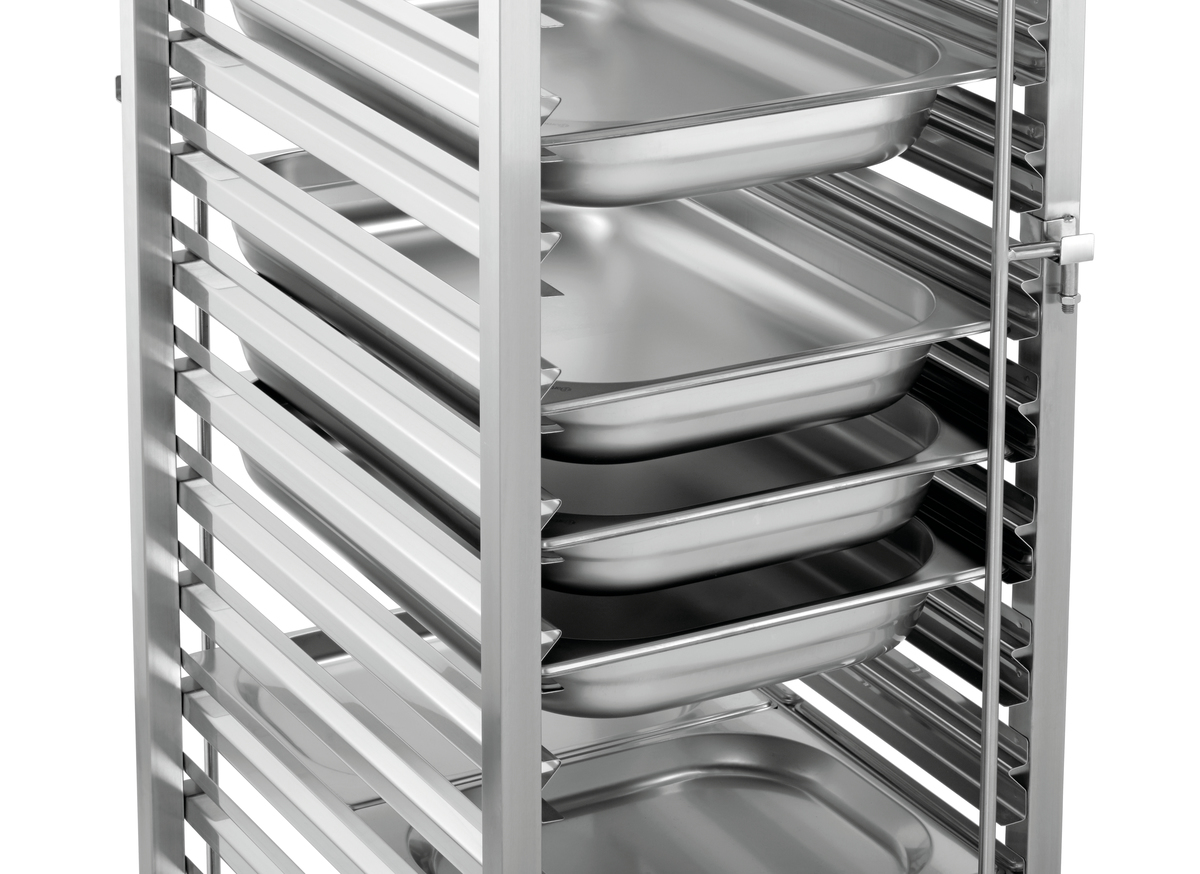 Gastronormwagen mit 15 Einschüben im GN-Format und einer maximalen Tragfähigkeit von 150 kg. Die besondere Bauweise ermöglicht ein ineinanderschieben von 2 oder mehr Gastronormwagen AGN1500-1/1 und somit eine platzsparende Lagerung.