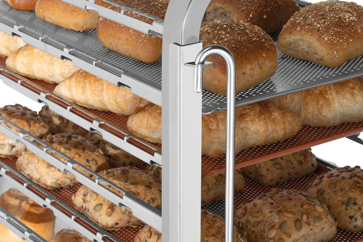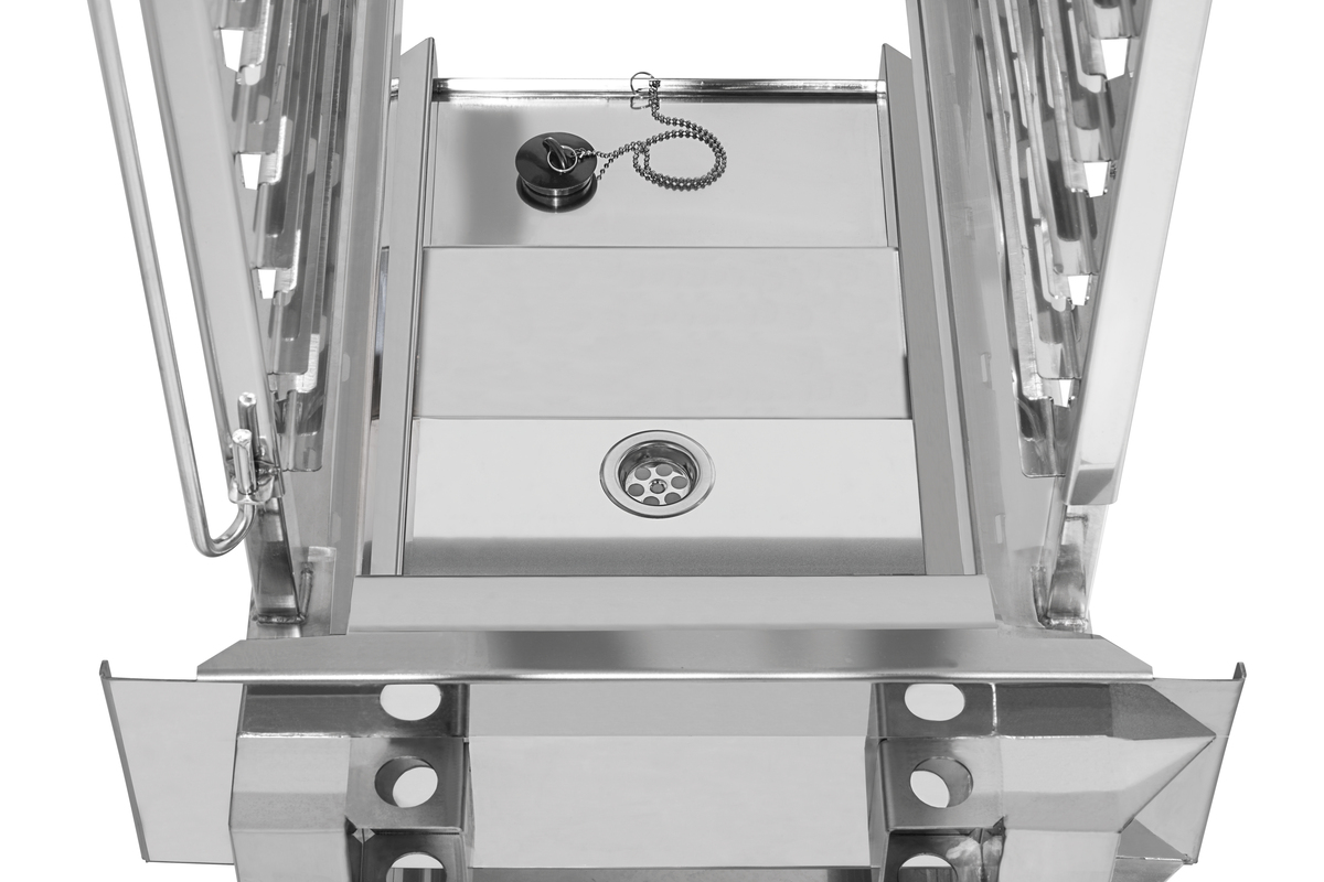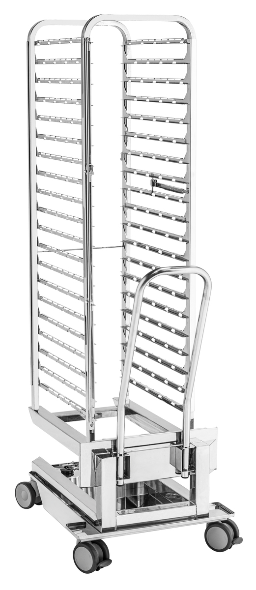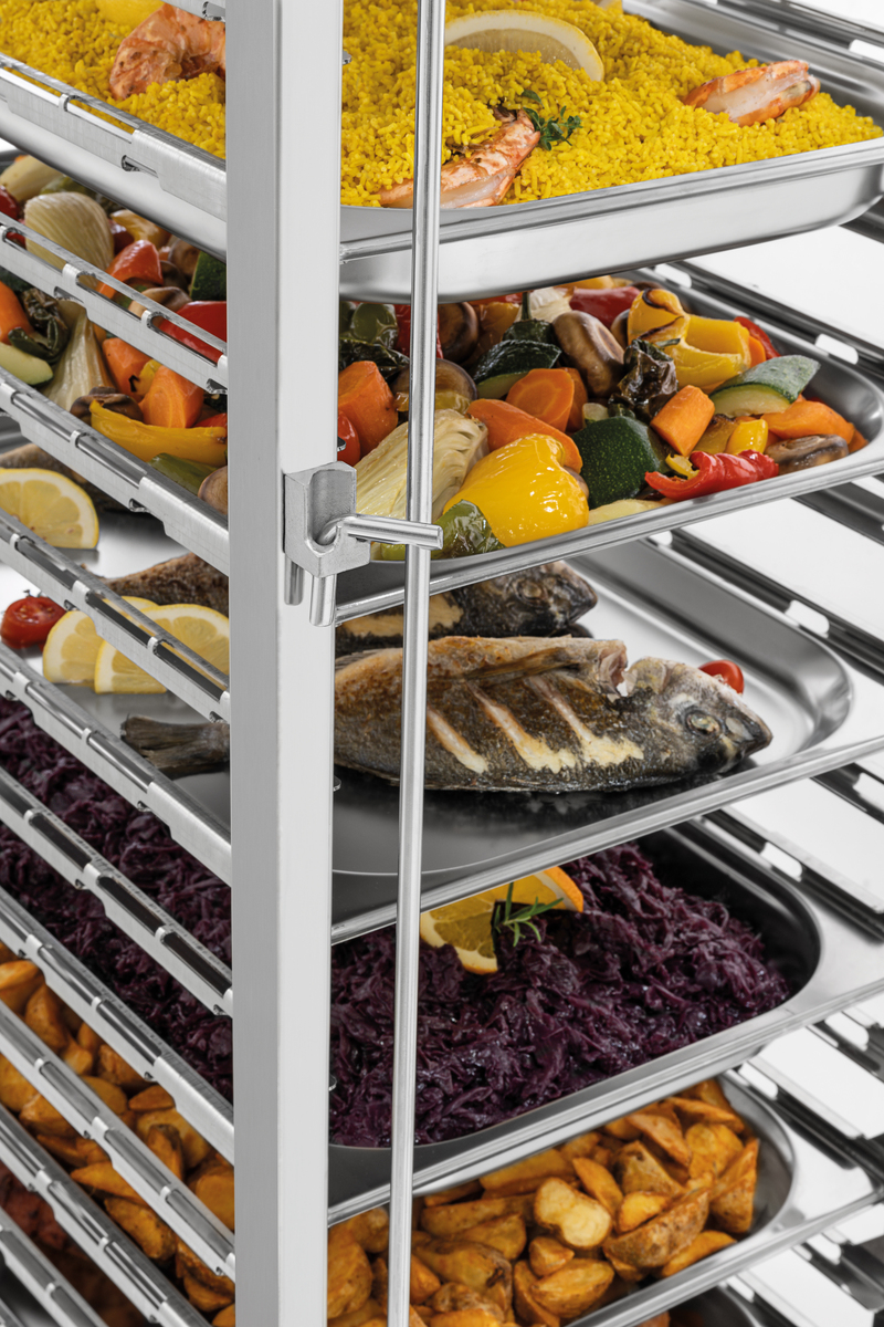 Für den fliegenden Wechsel: Der Hordenwagen ist die perfekte Ergänzung zum Kombidämpfer Gigasteam 20110DRS, denn wenn Zeitdruck herrscht, zählt jede Minute. Der Hordenwagen kann mit 20 GN-Behältern bestückt und nach Beendung des Garvorgangs umgehend gegen den zweiten Hordenwagen getauscht werden.