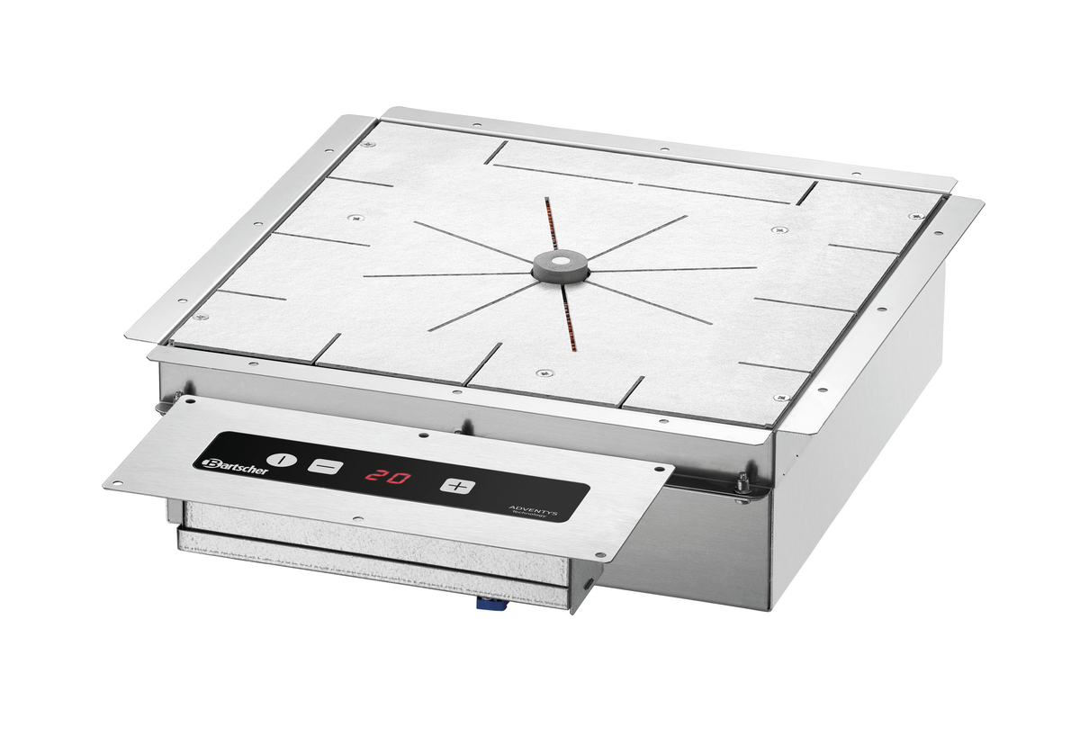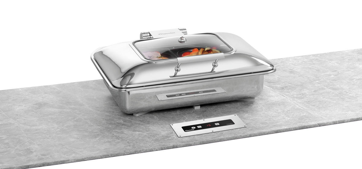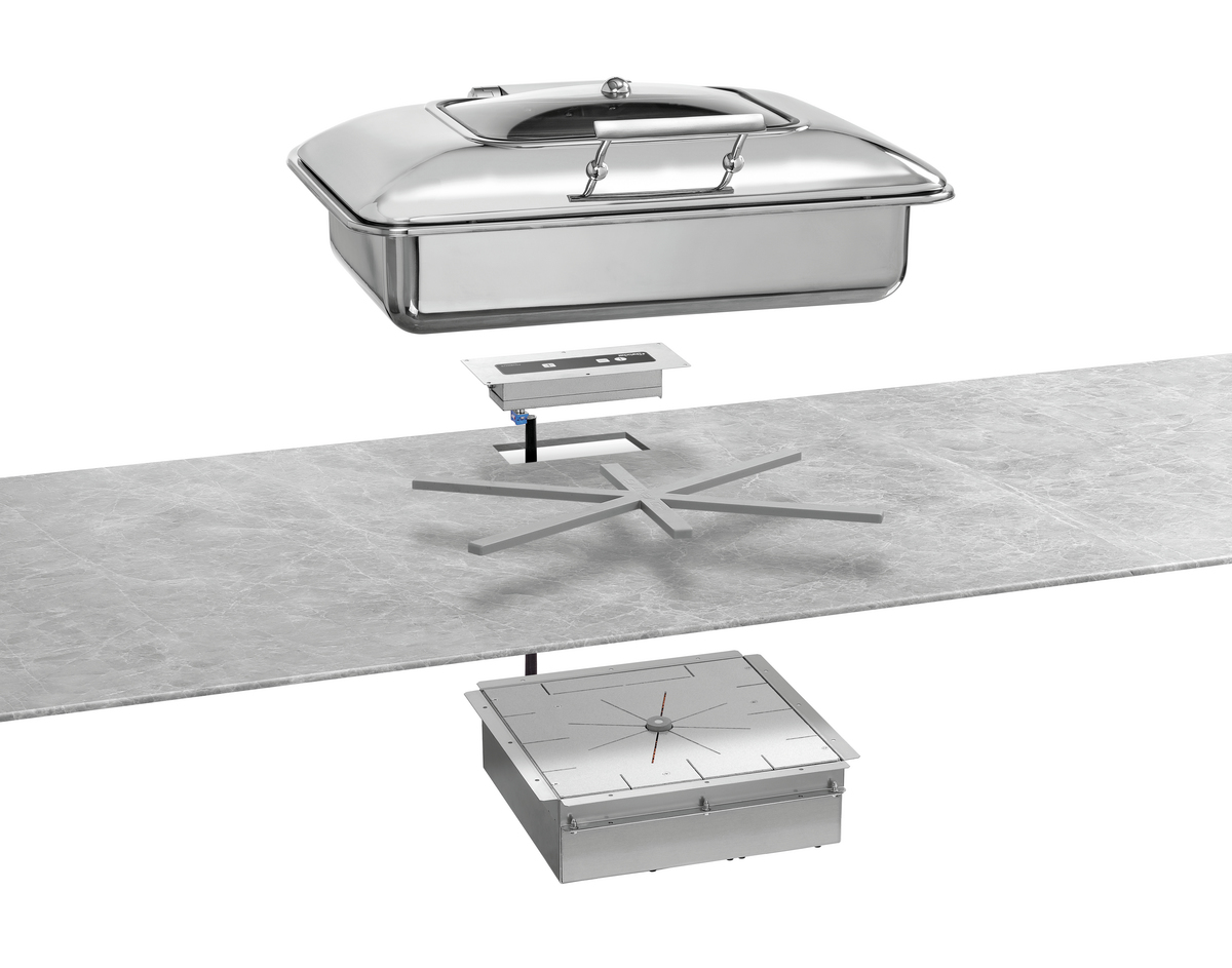 Mit dem „unsichtbaren“ Induktionswarmhaltesystem ist die Arbeitsplatte wahlweise als Warmhaltestelle oder Arbeitsfläche nutzbar. Verbaut unter einer Arbeitsplatte ermöglicht die beeindruckende Technik, dass ein Chafing Dish auf bis zu 100 °C erwärmt wird während die Arbeitsplatten-Temperatur maximal 35 °C erreicht.
