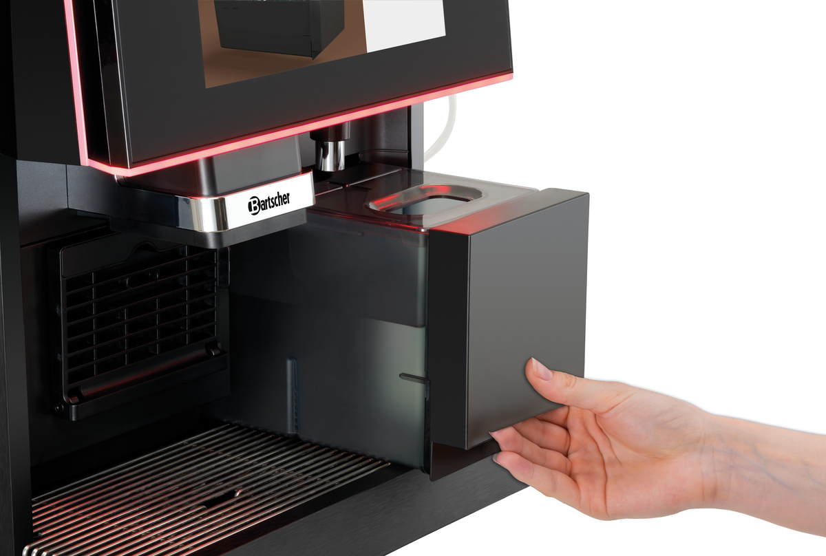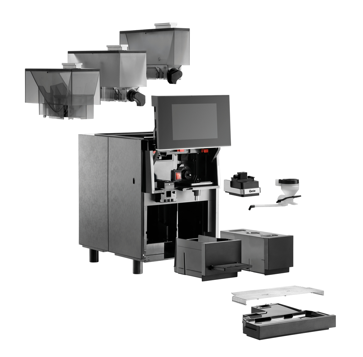 - Eigenschaften: Bodenplatte mit Ausschnitt für einen automatischen Trester-Auswurf ,Bohnen-/Toppingbehälter und Brüheinheit werkzeuglos herausnehmbar
