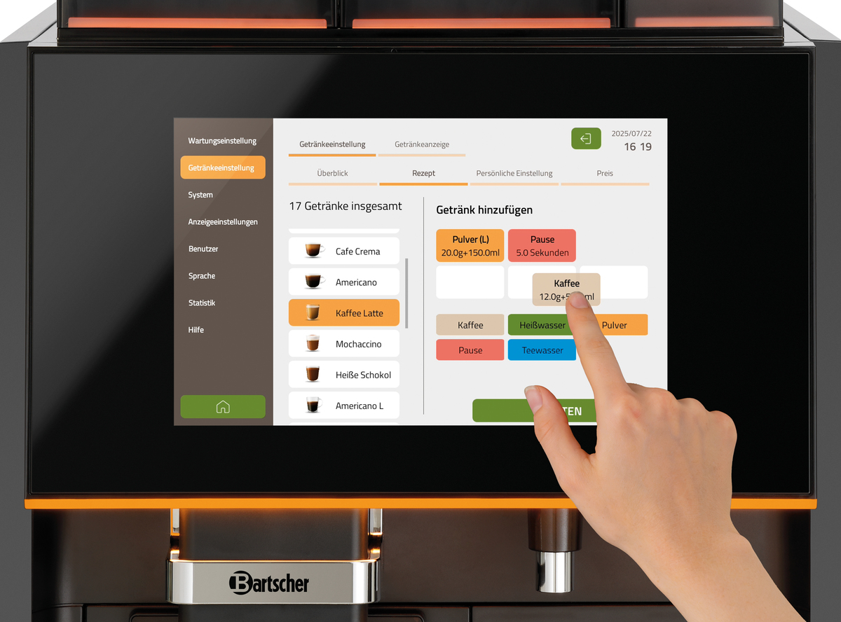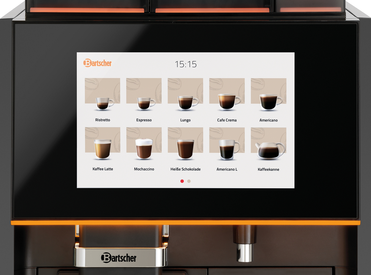 - Einstellmöglichkeiten: Bedienermodus (Standard, Selbstbedienermodus, Professional Modus) ,Kaffeedosierung ,Getränkenamen ,Stufenlose Mahlgrad-Einstellung ,Pulvermenge, grammgenau durch Kalibrierung ,Videoanzeige ,Vorbrühmenge ,Wassermenge ,Wassertemperatur (über Boiler bis 98 °C)