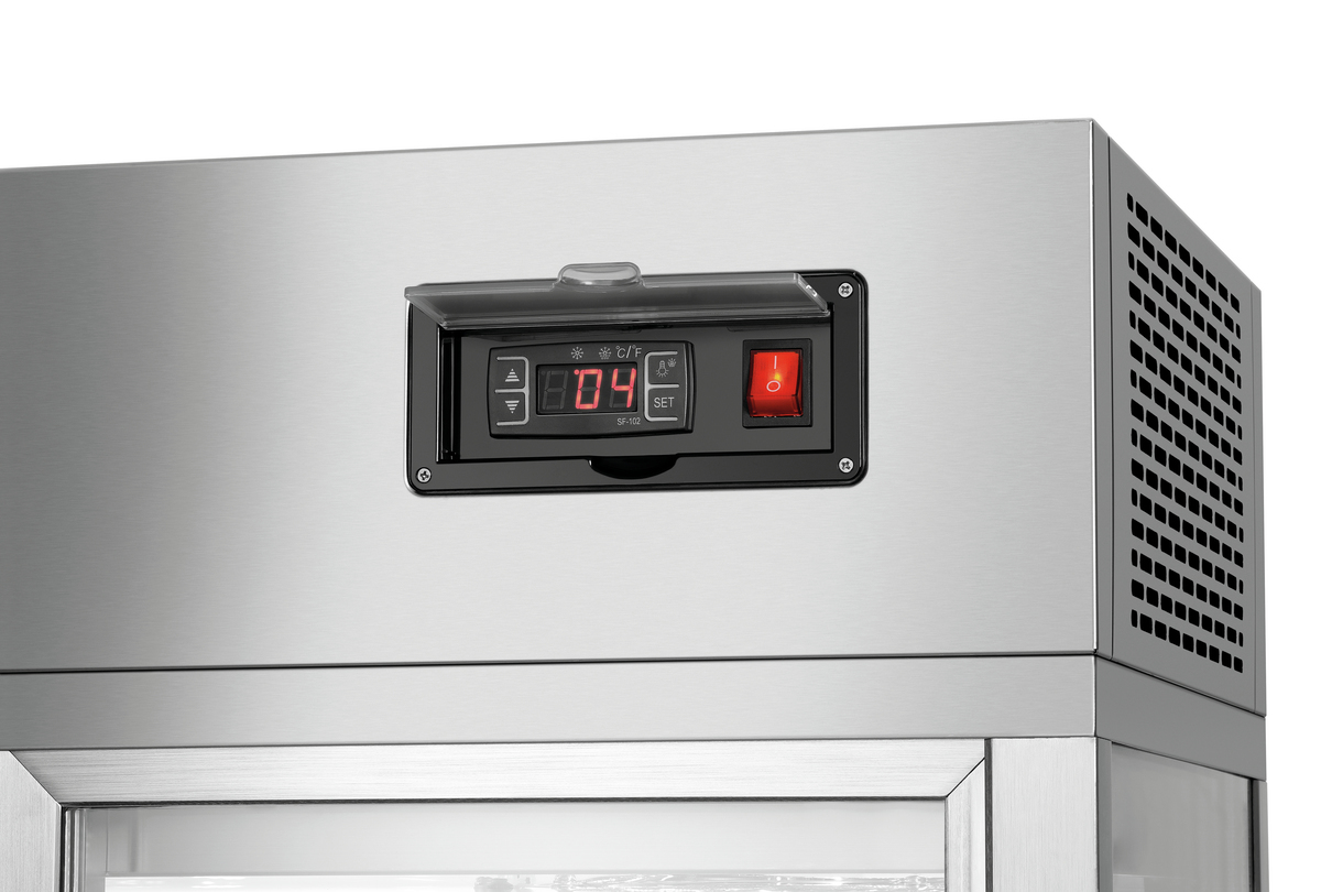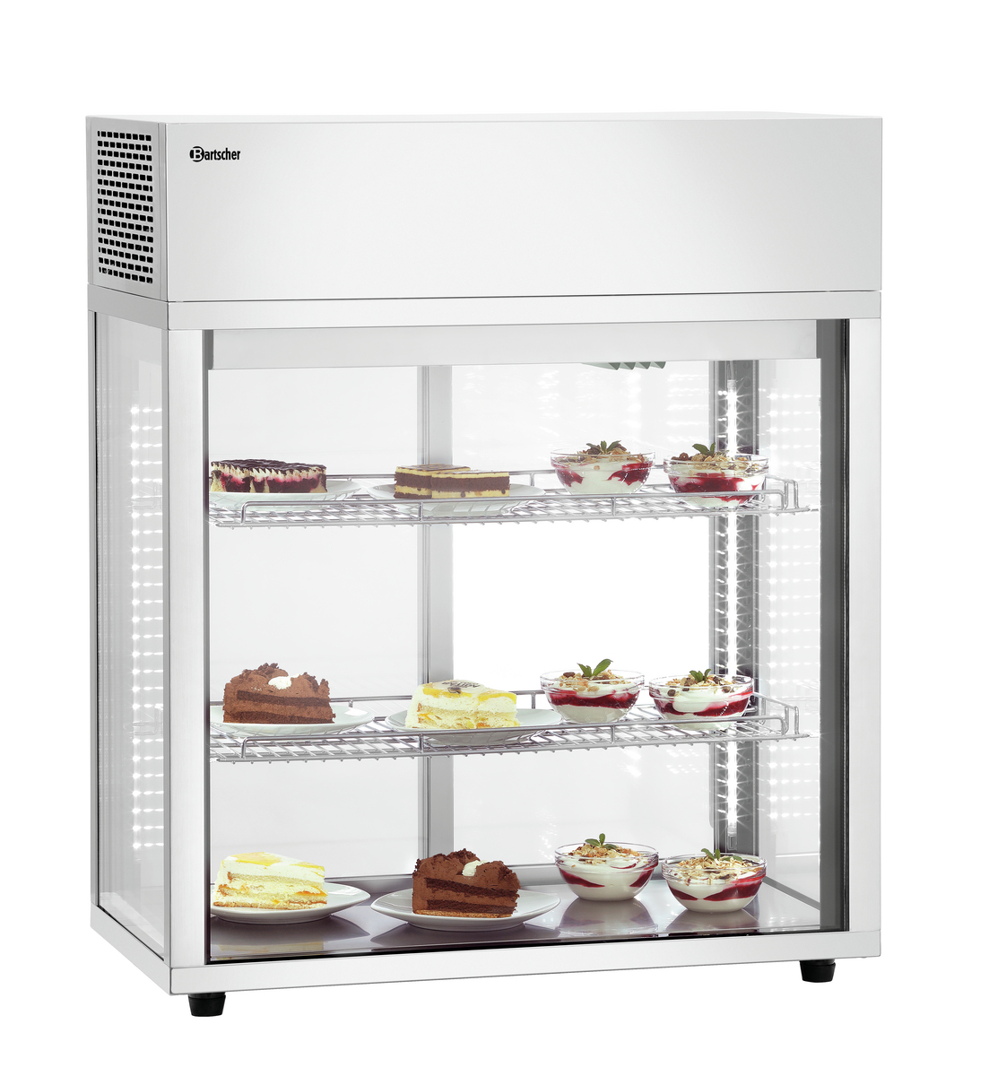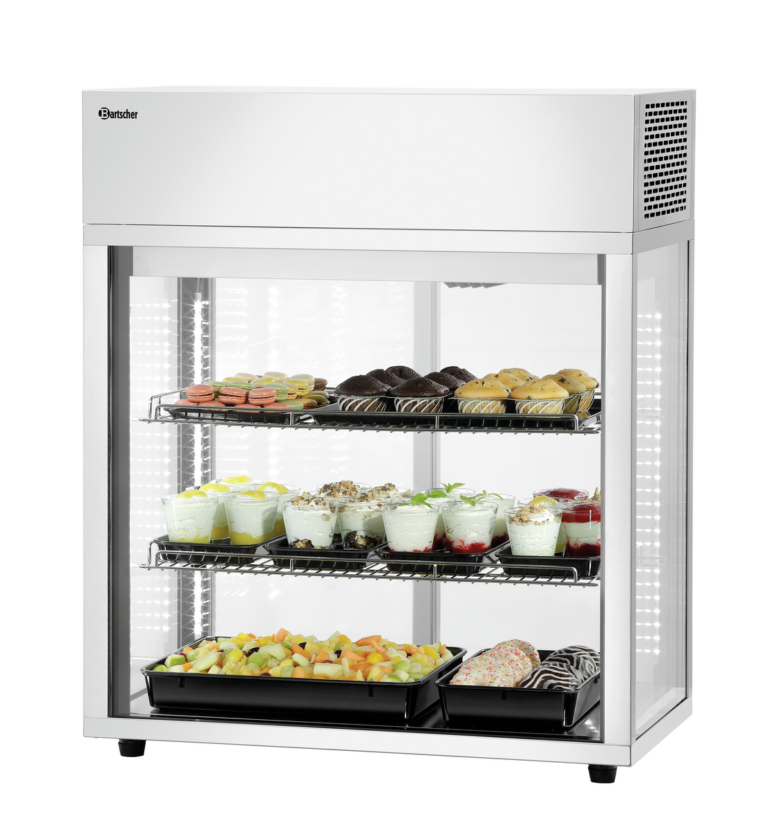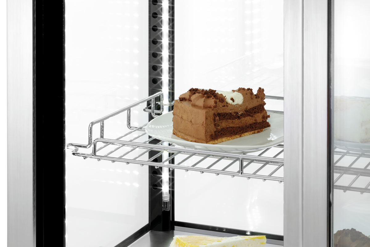 Auftisch-Vitrine im hochwertigen Edelstahl-Glas-Design zur Auslage von Speisen und Snacks in Kantinen, Ladenlokalen, Bars oder Cafés. Ein platzsparendes und einfaches Handling ermöglichen die Glasschiebetüren - Für die perfekte Präsentation sorgt die LED-Beleuchtung.