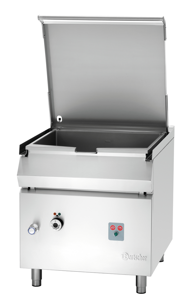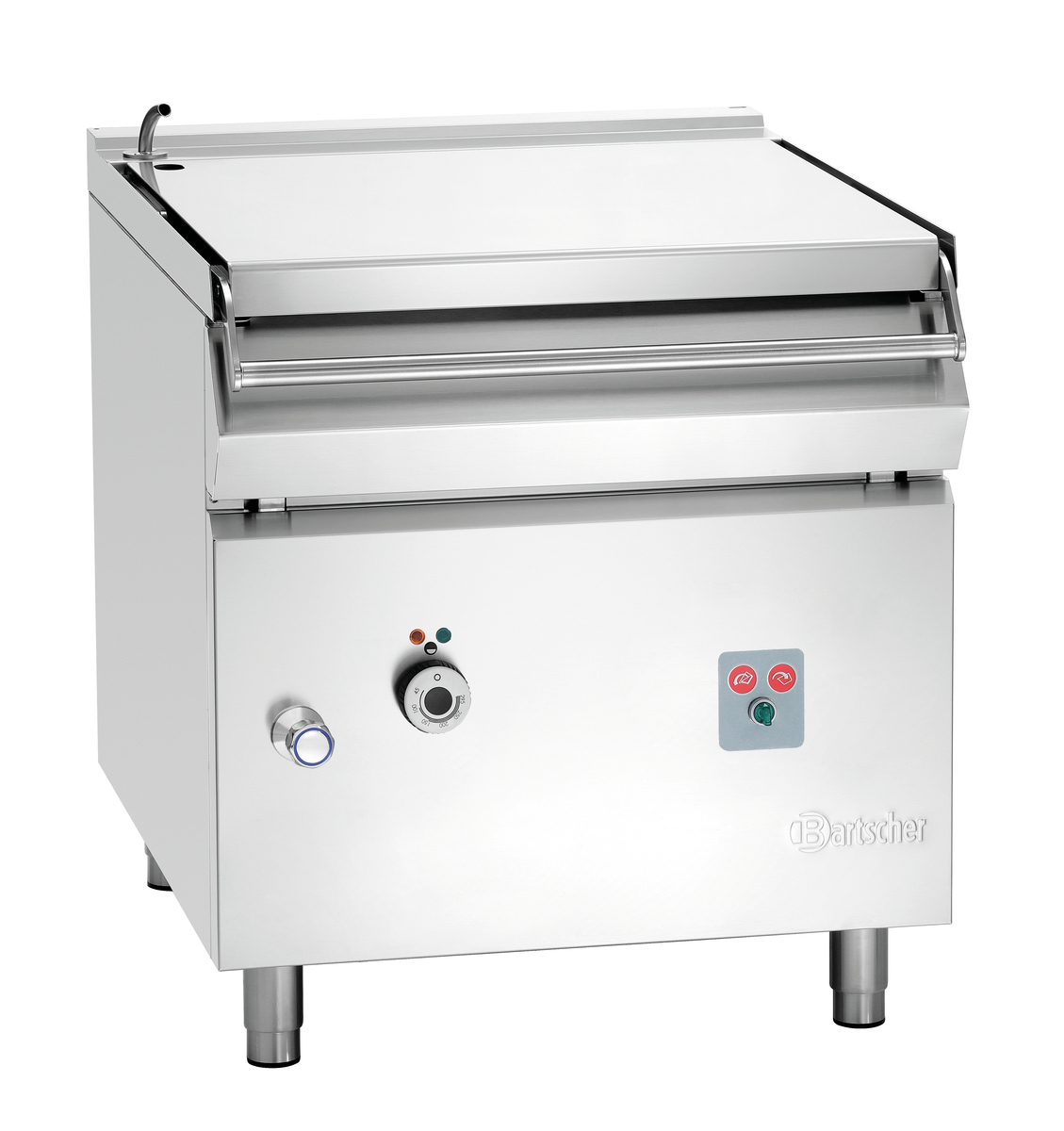 Kippbratpfanne der Serie 900 in bekannter hochwertiger Edelstahl-Ausführung. Der Tiegel ist vollständig aus Edelstahl und fasst bis zu 70 Liter. Das Elektro-Modell mit elektromotorischer Kippvorrichtung verfügt über einen Wassereinlaufhahn und ist ausgelegt für einen Kalt- oder Warmwasseranschluss.