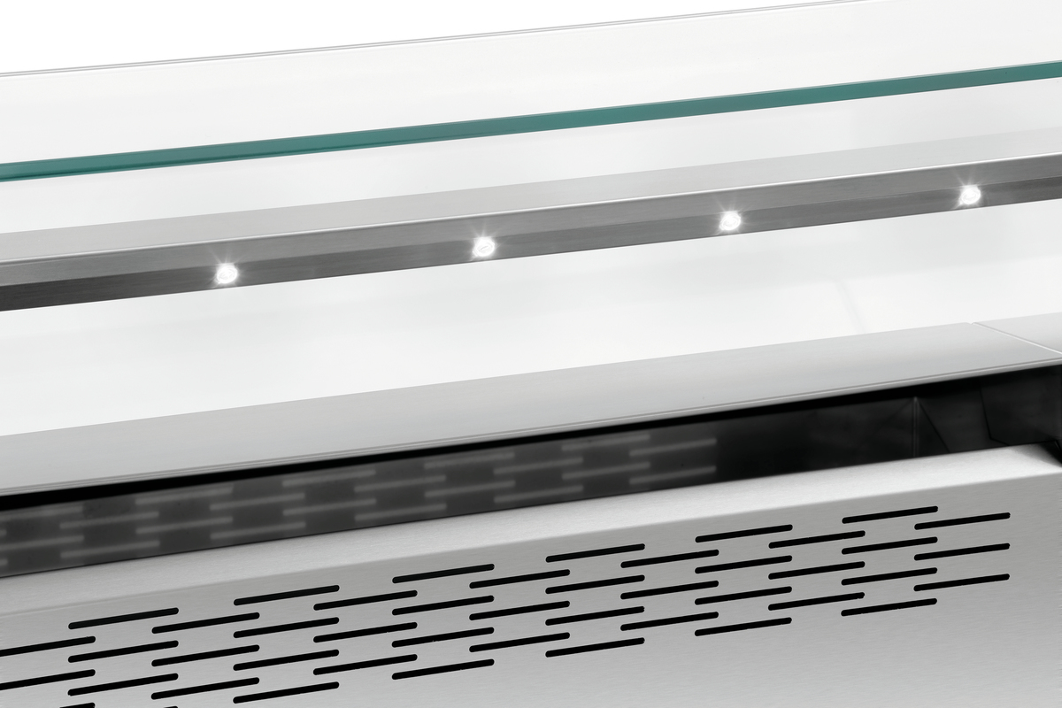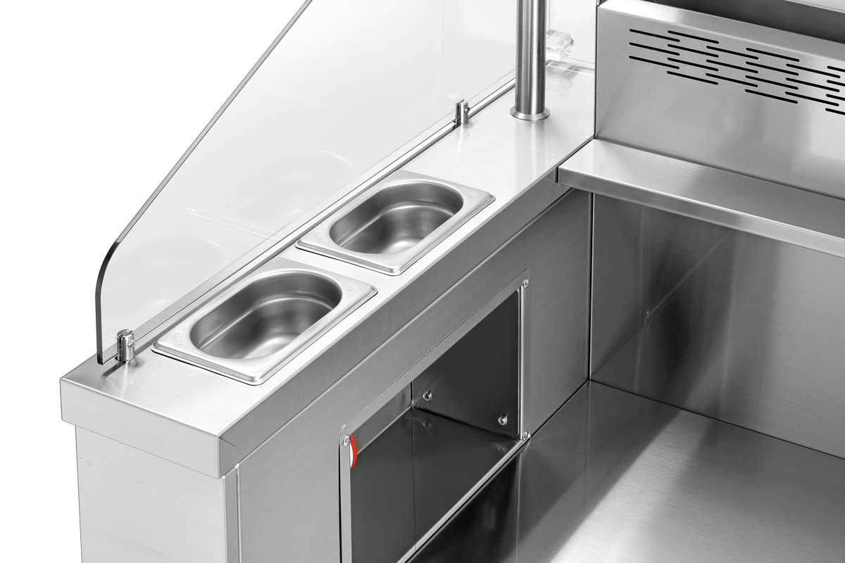 - Ausgestattet mit: 4 GN-Behältern 1/9 GN, 100 mm tief für Öle, Soßen, Kochbesteck ,Ablagefach unterhalb der Einstellnischen, Maße: B 805 x T 600 x H 150 mm ,Integrierte elektrische Absicherung ,Integrierte Lüftung mit Flammschutzfilter