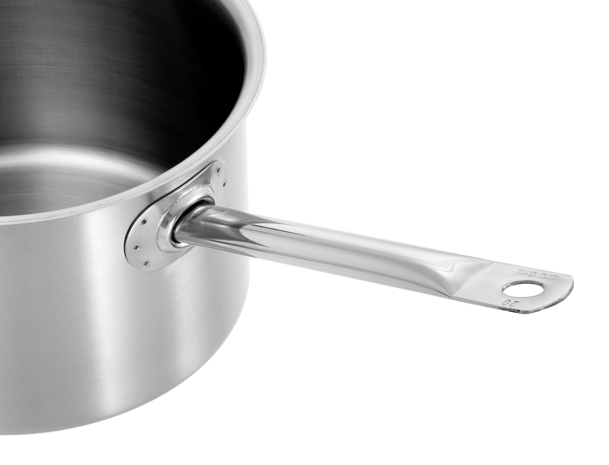 Der Kochtopf aus Edelstahl ist ein Allrounder auf allen Herdarten. Mit dem fest angebrachten langen Griff garantiert er ein optimales Handling in der Küche.