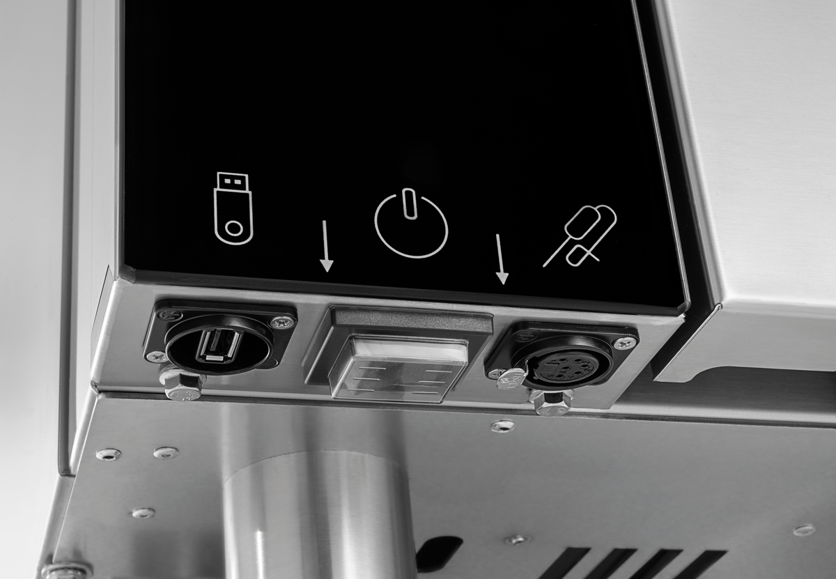 - Kerntemperaturfühler-Anschluss: Front, unten