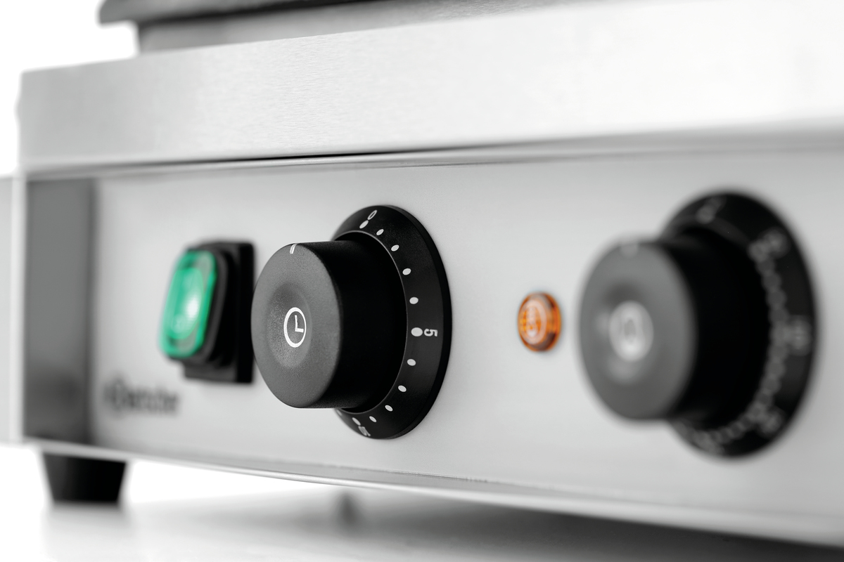 Leistungsstarker Kontaktgrill mit großer Grillfläche und integriertem Timer - Die solide Bauweise mit Grillplatten aus Gusseisen sorgt für eine gute und saubere Verarbeitung der Speisen.