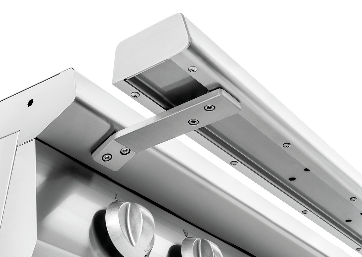 Die Geräte der Serie 700 mit einer Küchen-Reling zu versehen bietet nicht nur eine stilvolle Ergänzung, sondern optimiert auch die Sicherheit und Funktionalität. Durch den erweiterten Abstand zum Gerät verringert sich effektiv die Verbrennungsgefahr an den Hochtemperaturzonen. Darüber hinaus ermöglicht die robuste Konstruktion eine komfortable Zwischenlagerung von Töpfen, Pfannen und Tellern.