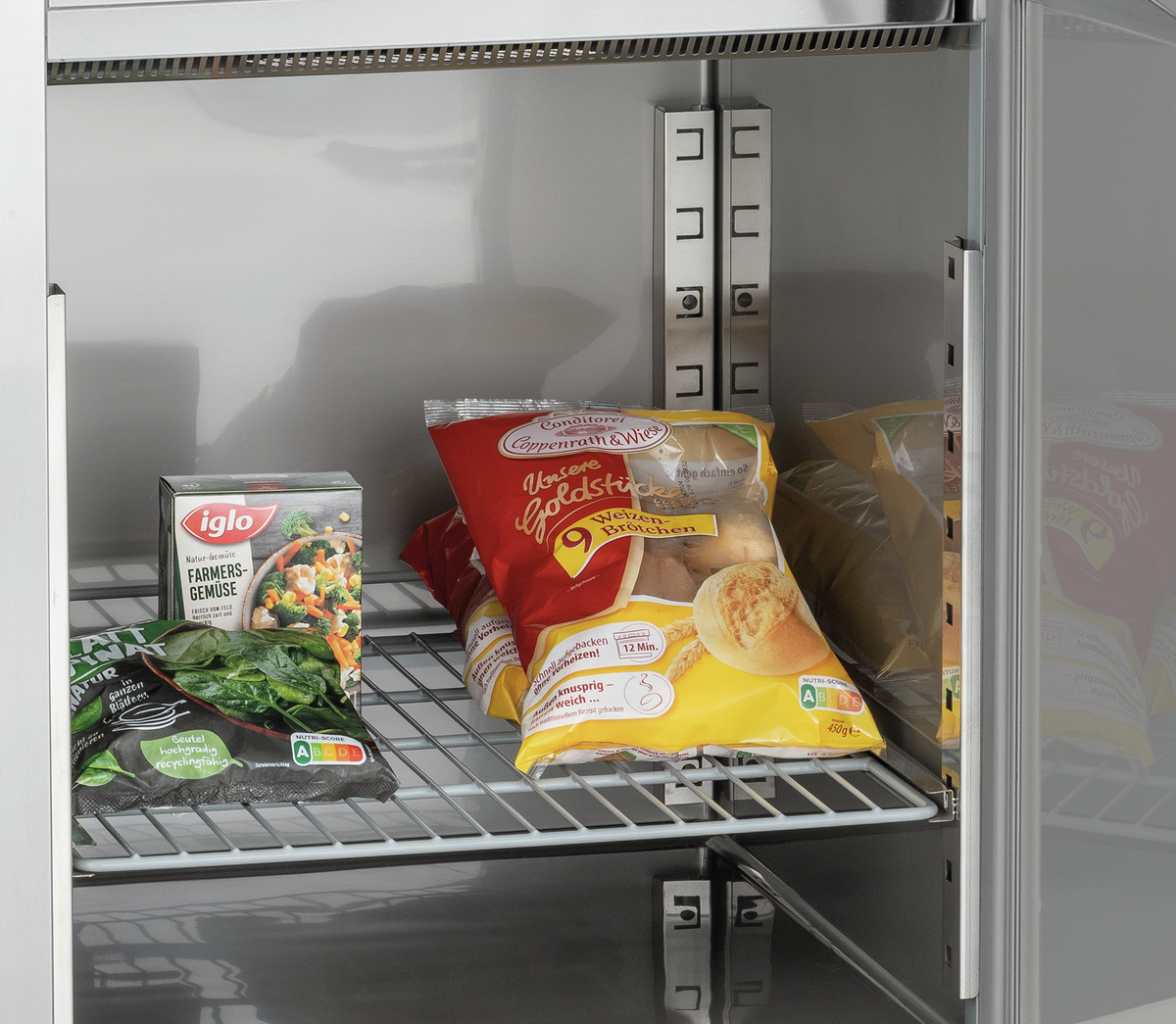 Das Kombigerät vereint Kühlung und Tiefkühlung und bietet somit einen schnellen Zugriff auf gekühlte und tiefgekühlten Waren bei geringem Platzbedarf. Die GN-fähigen Auflageschienen können sowohl für die beiliegenden Roste als auch für GN-Behälter genutzt werden.
