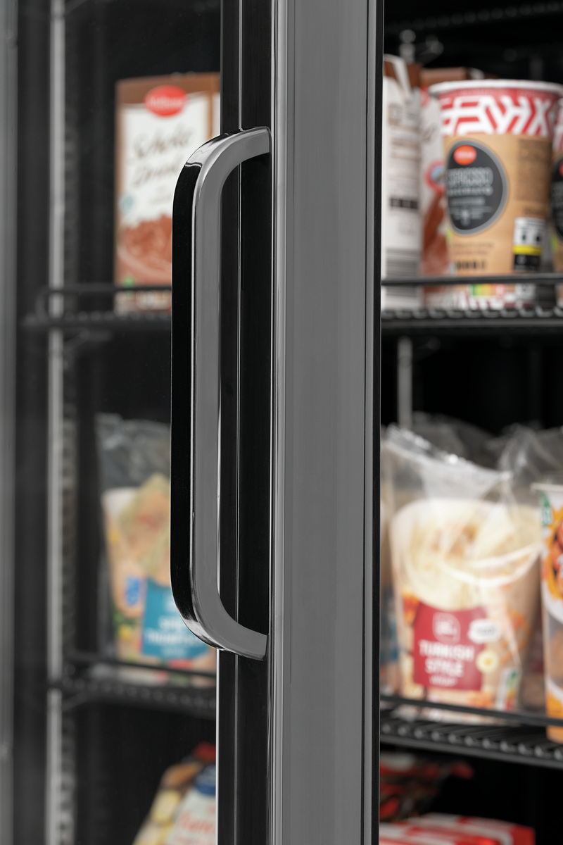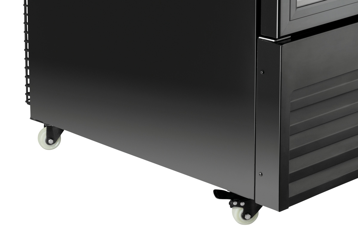 Kombination aus Kühlschrank und Tiefkühlschrank in komplett schwarzem Design mit einem Fassungsvermögen von 820 Litern. Die Glastüren ermöglichen einen direkten Einblick auf die Speisen, die durch die separat schaltbare LED-Beleuchtung ins rechte Licht gerückt werden können.