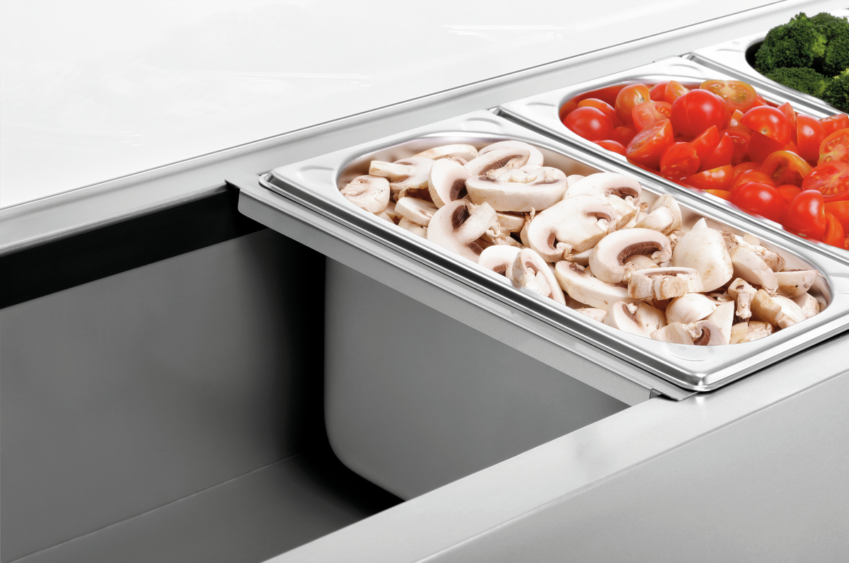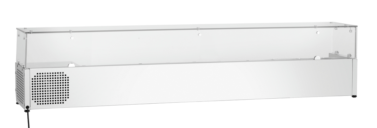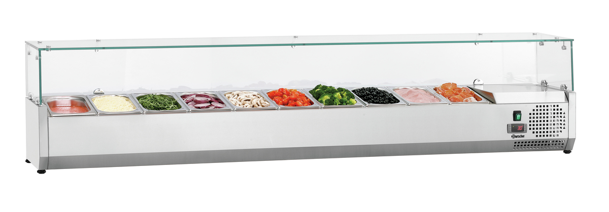 Mit Platz für bis zu 10x 1/4 GN Behälter ist die Kühlaufsatzvitrine GL3-2005 mit Glasaufsatz die perfekte Ergänzung zum Pizzakühltisch G-S7T2.