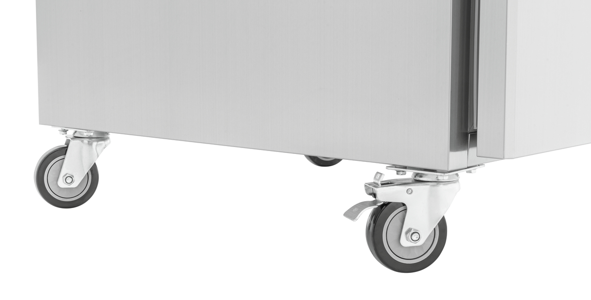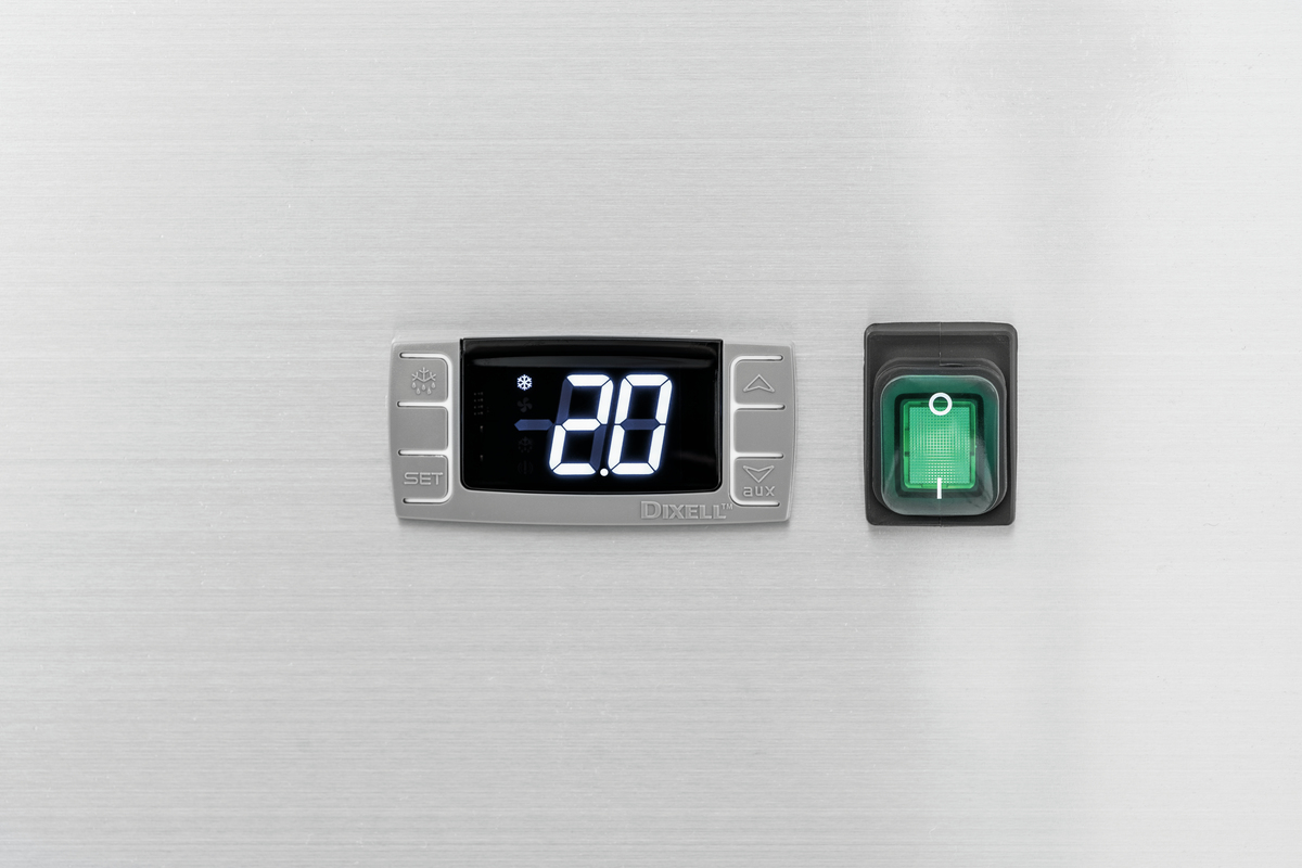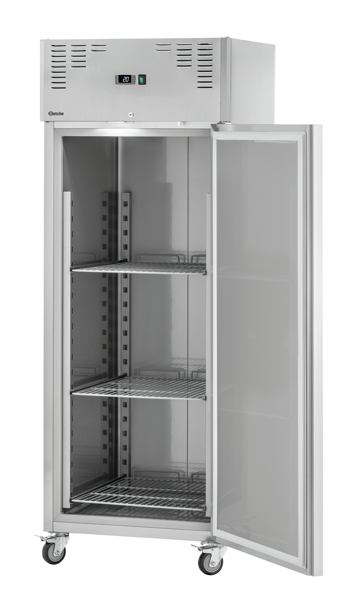 Dank des großzügigen Platzangebots lässt sich Kühlware auf den höhenverstellbaren Rosten im 2/1 GN-Format übersichtlich lagern und bevorraten. Die leistungsstarke Umluftkühlung des Edelstahl-Kühlschranks trotzt der Größe und sorgt im Innenraum für eine gleichmäßige und konstante Temperatur.