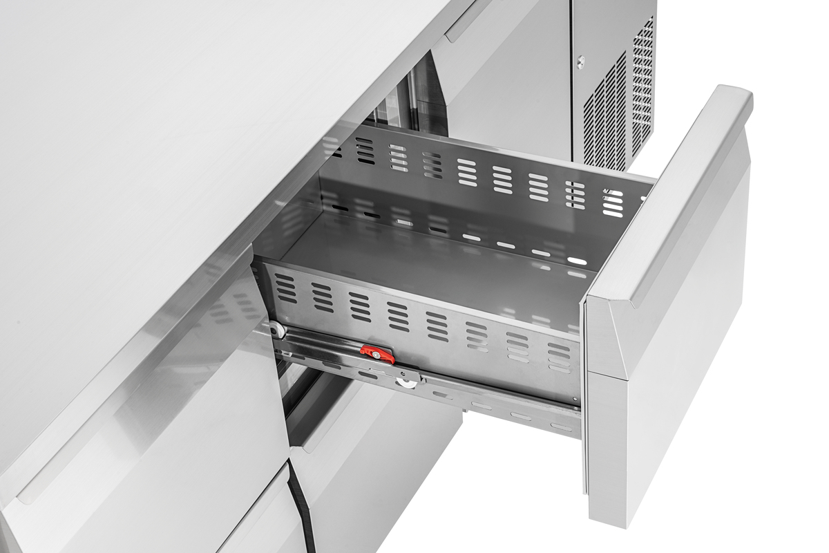 Der Kühltisch mit 1 Tür und 4 Schubladen gewährleistet durch die Umluftkühlung eine gleichmäßige und konstante Kühltemperatur im gesamten Innenraum. Die robuste Edelstahloberfläche fügt sich nahtlos in jede Küche ein und kann zugleich als praktische Arbeitsfläche genutzt werden. Dank Klimaklasse 5 ist dieser Kühltisch auch für besonders warme Umgebungen geeignet.