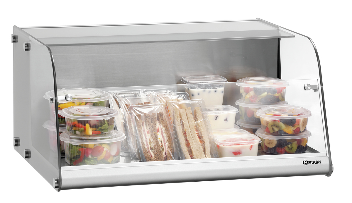 Aufsatzvitrine für den Selbstbedienungsbereich - Ideal für kalte Getränke, Joghurts oder auch kühl zu lagernde Snacks wie z. B. Sandwiches, die auf der Edelstahl-Stellfäche von 645 x 300 mm ihren Platz finden. Die öffnung an der Vorderseite der Kühlvitrine ermöglicht eine schnelle Enthnahme und verlockt schnell zu Impulskäufen.