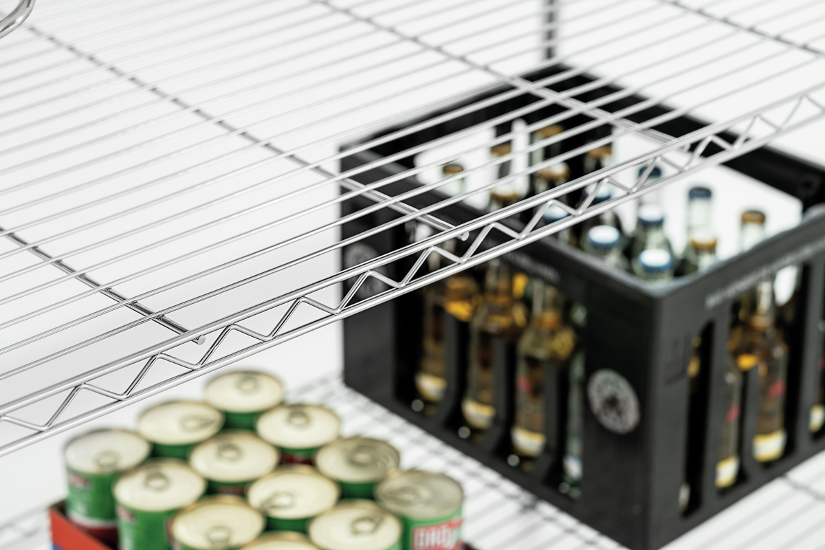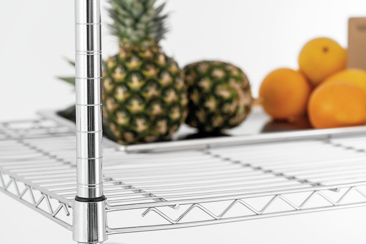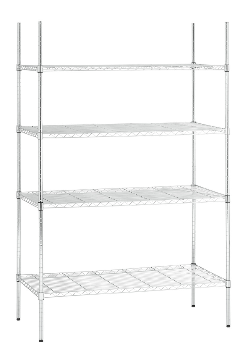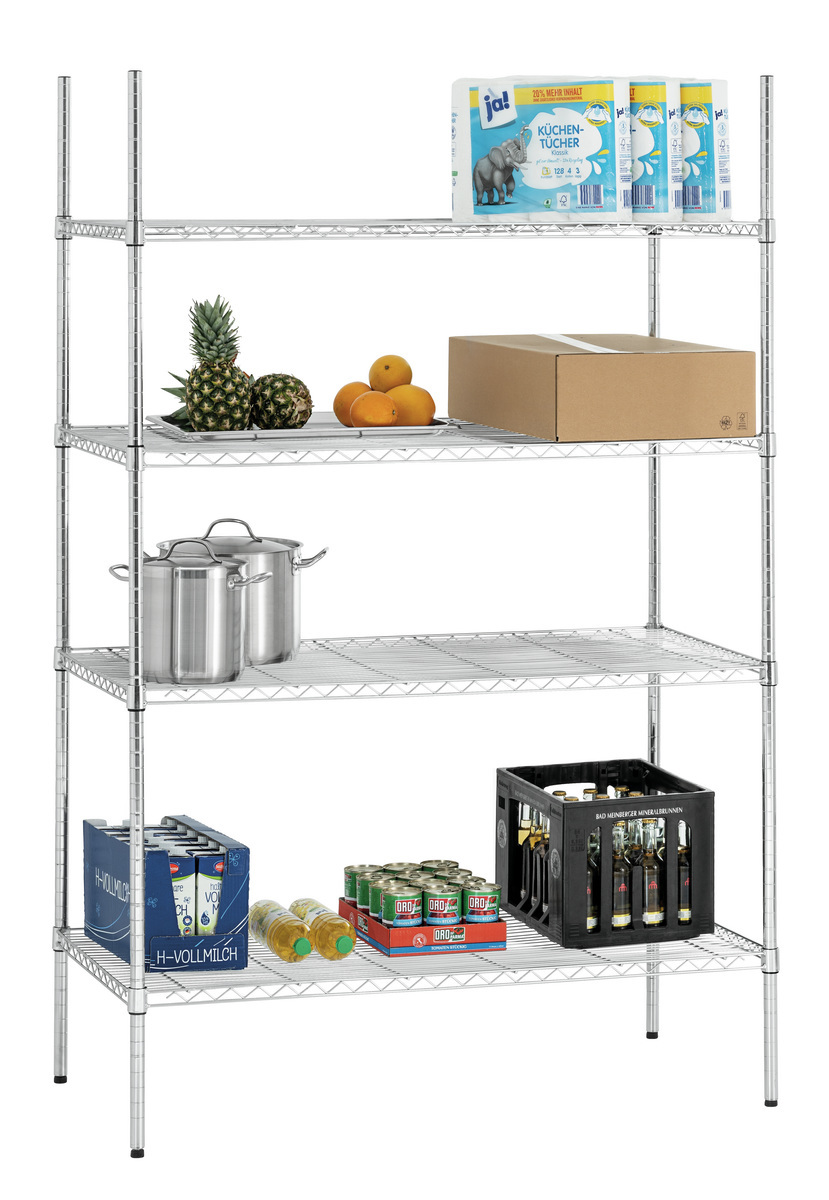 Lagerware optimal verstauen - diese Möglichkeit bietet das Standregal auf 4 höhenverstellbaren Ebenen aus verchromtem Stahl. Dank des einfachen Stecksystems lässt sich dieses im Handumdrehen montieren und ist direkt einsatzbereit.