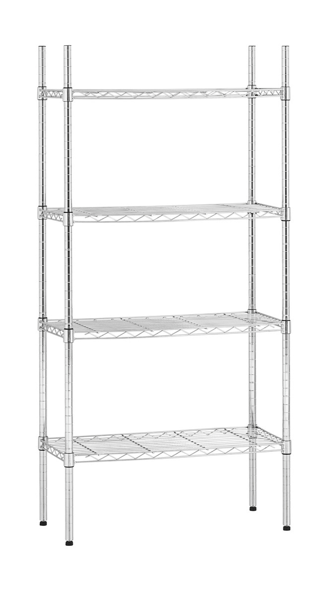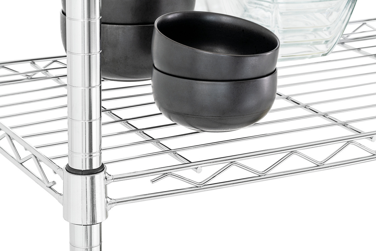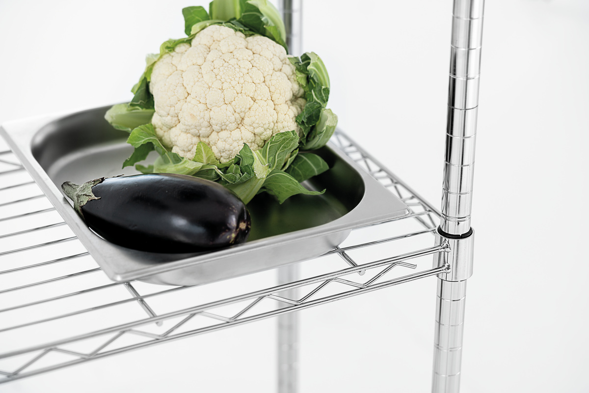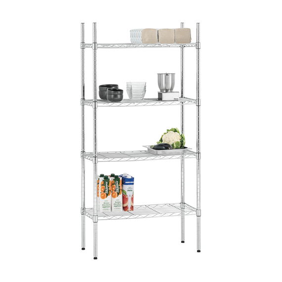 Lagerware optimal verstauen - diese Möglichkeit bietet das Standregal auf 4 höhenverstellbaren Ebenen aus verchromtem Stahl. Dank des einfachen Stecksystems lässt sich dieses im Handumdrehen montieren und ist direkt einsatzbereit.