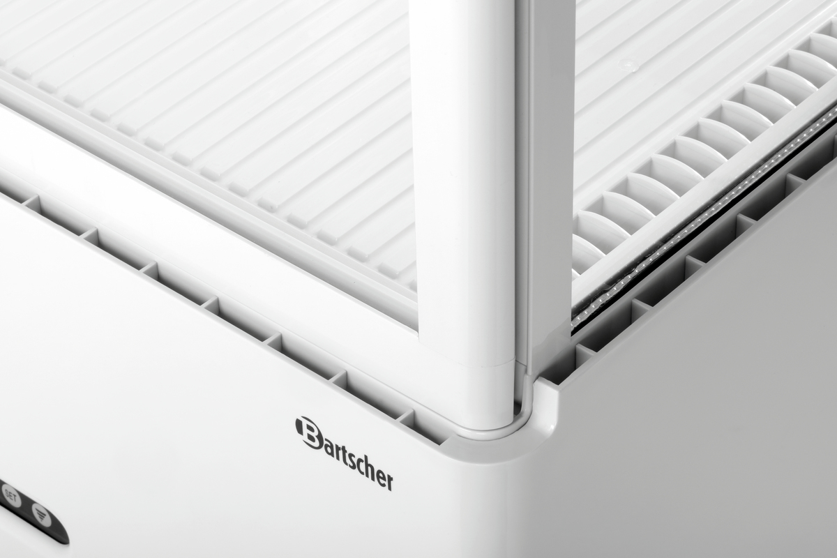 Die kompakte Kühlvitrine mit einem Fassungsvermögen von 78 Litern überzeugt an Orten mit einer hohen Luftfeuchtigkeit. Eine extra darauf ausgerichtete Lüftung verhindert mit Hilfe der warmen Abluft das Beschlagen der Scheiben. Die Anordnung der Lüftungsschlitze garantiert dabei eine freie Sicht auf ganzer Höhe.