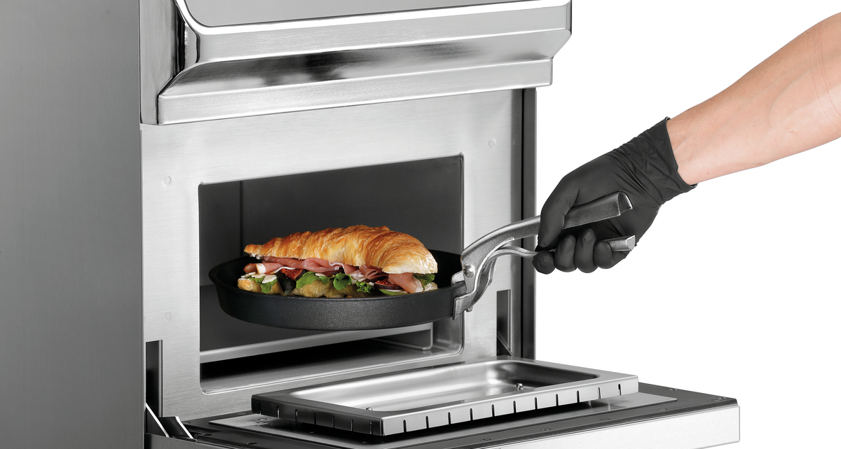 Die solide Ausführung der Ofenzange ermöglicht unkompliziert ein sicheres Bestücken und Herausnehmen voll bestückter Garteller und Pizzableche des Snackjet.