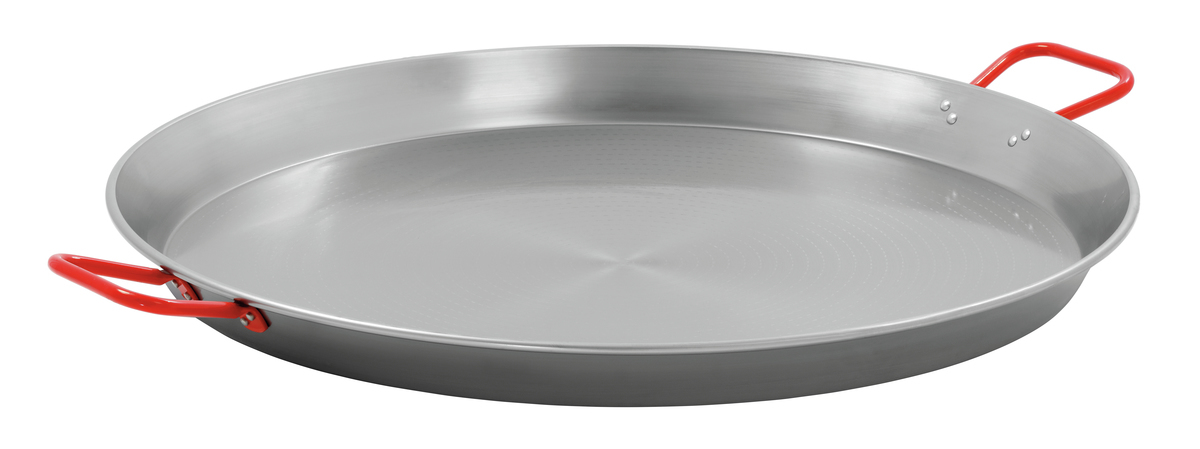 Robust, ganzflächig aus poliertem Stahl, strukturierte Garfläche mit hohem Rand, hitzebeständige Griffe - Die Bartscher-Paella-Pfannen sind auch bestens geeignet für die Zubereitung von Bratkartoffeln, Geschnetzeltem, Pfannengyros, oder Chili con carne.