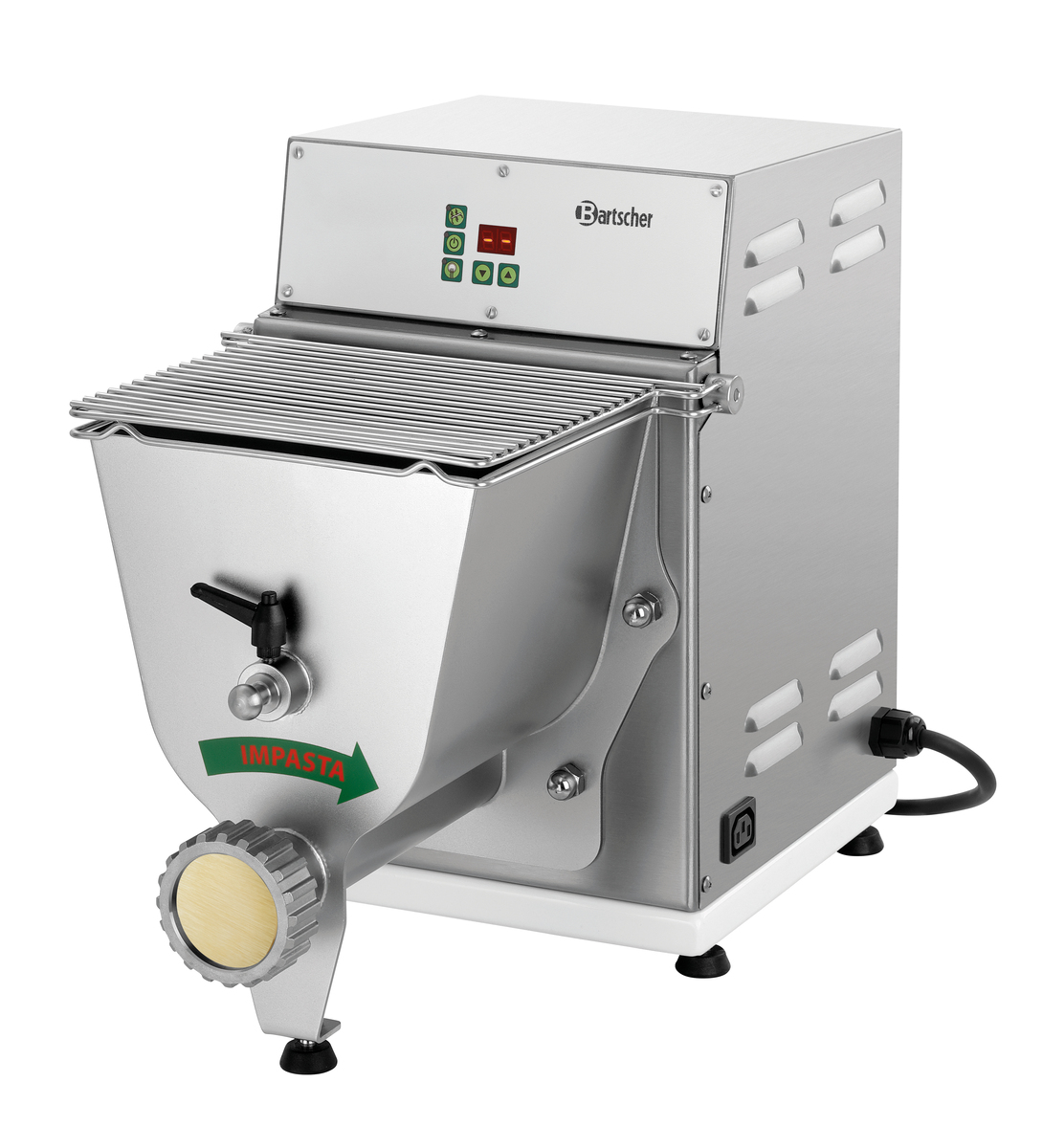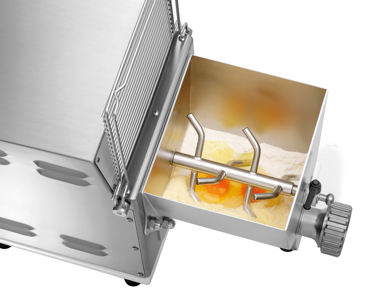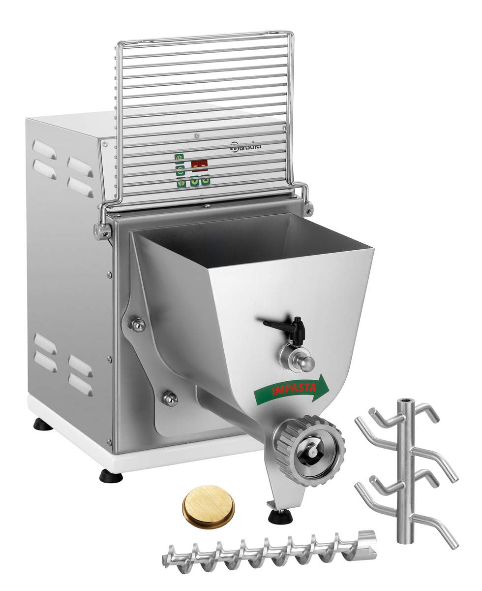 - Eigenschaften: 5 sichere Standfüße ,Geräuscharm (kleiner 70 dB) ,Knetwelle und Transportschnecke entnehmbar ,Teigbehälter abnehmbar ,Zum Kneten und Ausrollen von 12 verschiedenen Pasta-Sorten (Pasta-Matrizen optional erhältlich) ,Mikroschalter am Schüsseldeckel