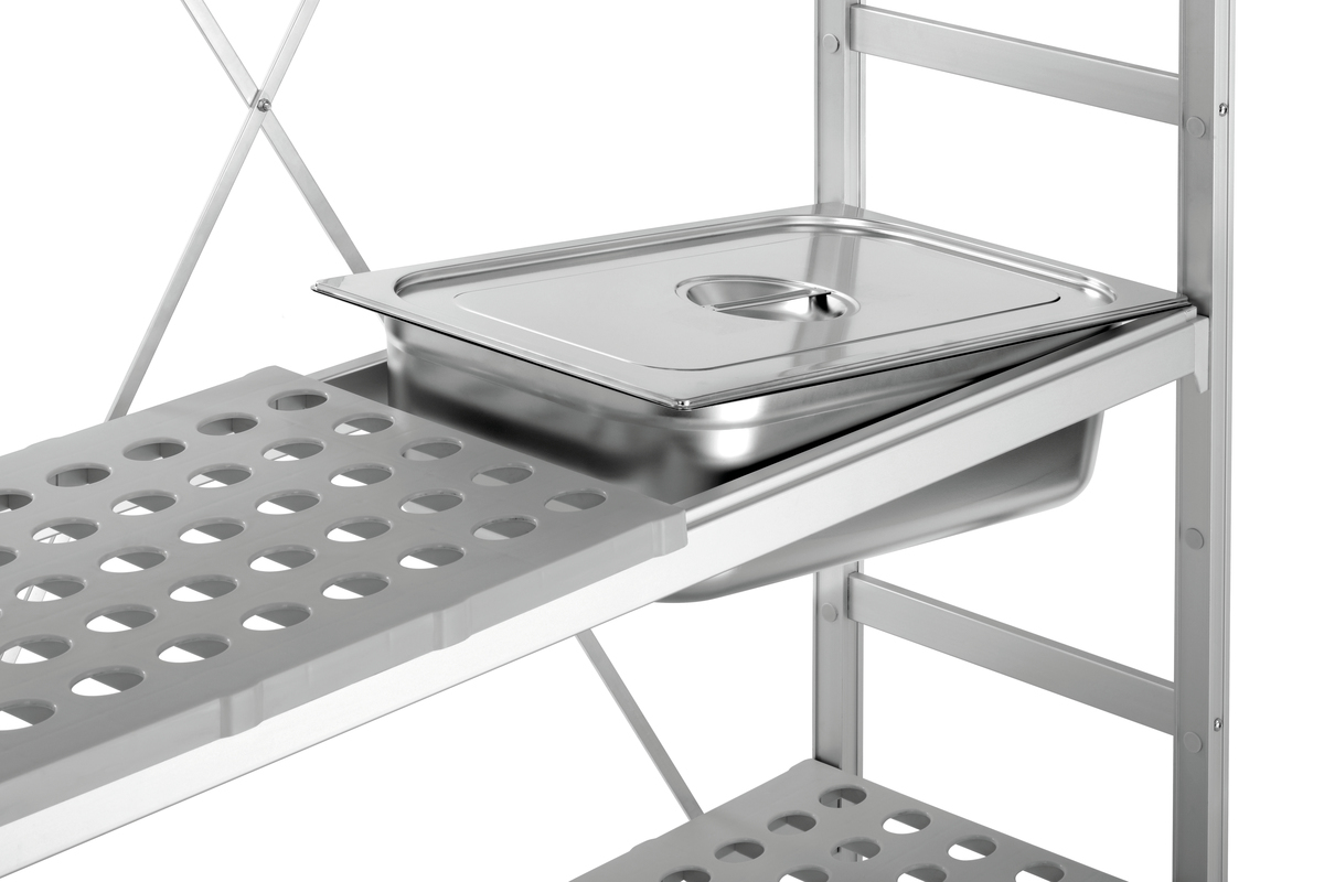 Das Regal ist nicht nur in allen Gastronomie-Bereichen einsetzbar, es ist zudem besonders vielseitig: Anstatt Regalböden können wahlweise GN-Behälter genutzt werden.