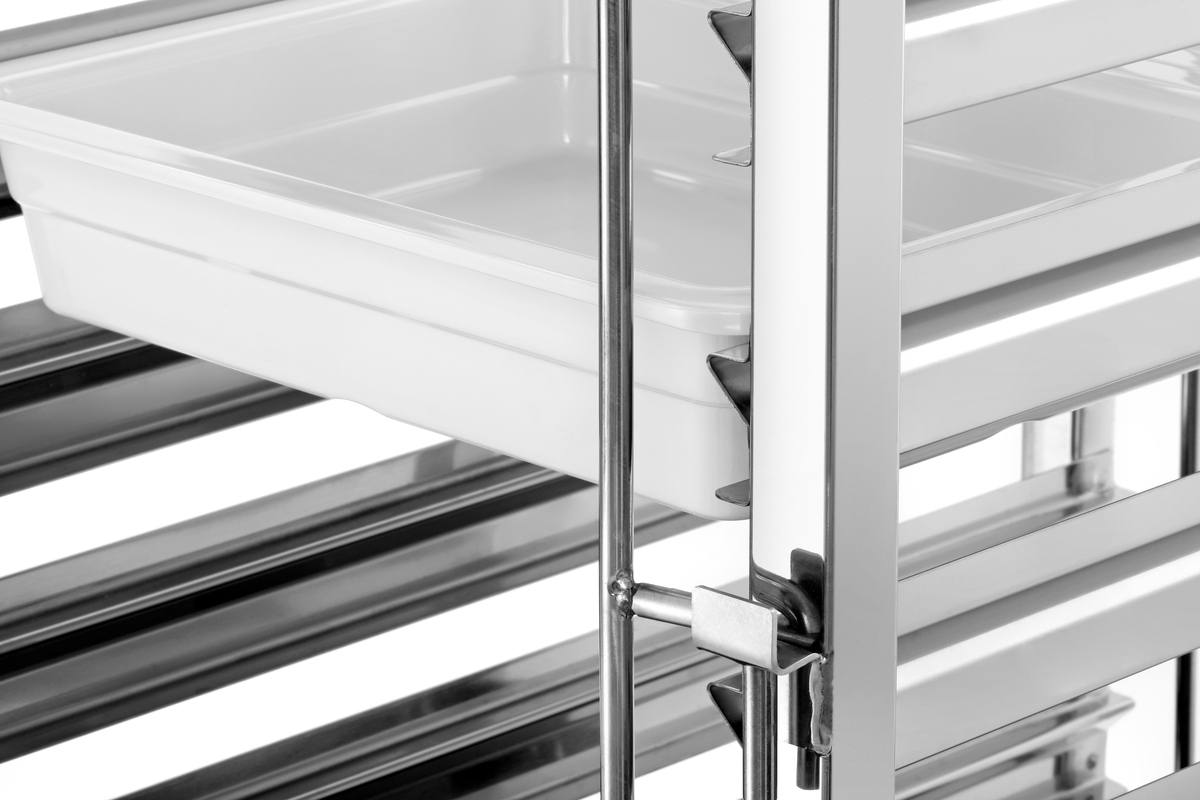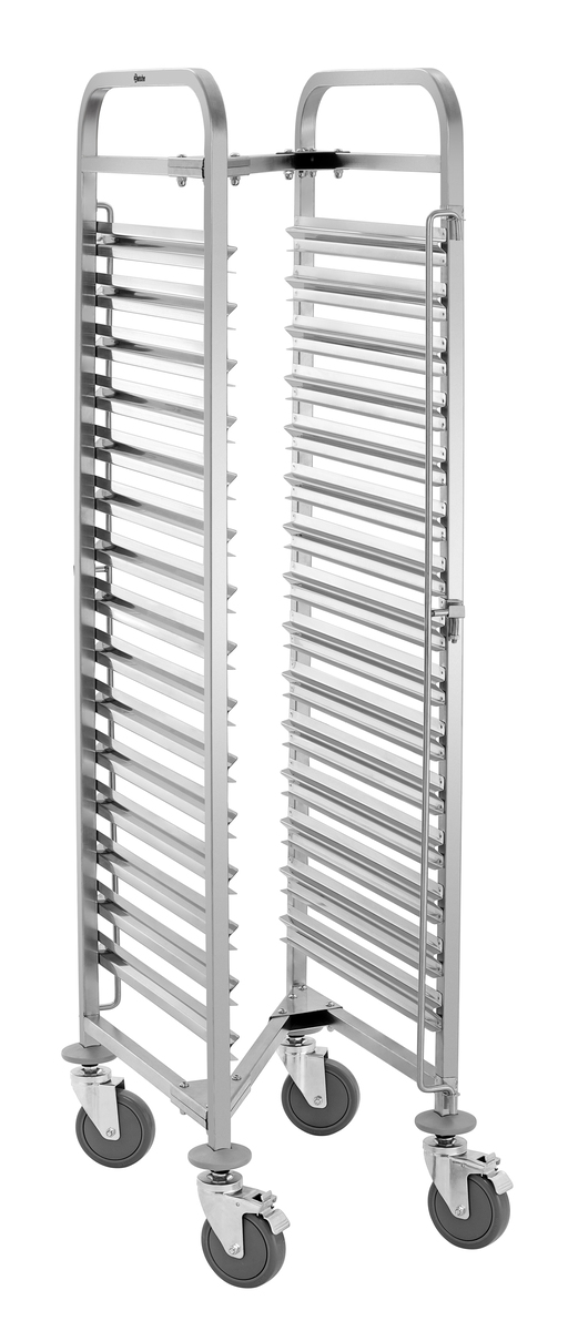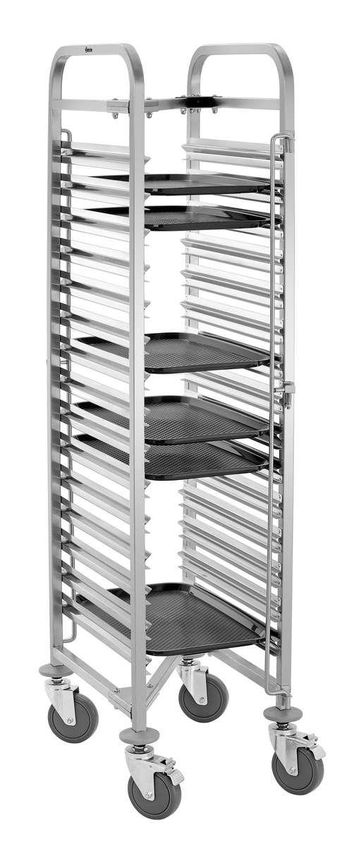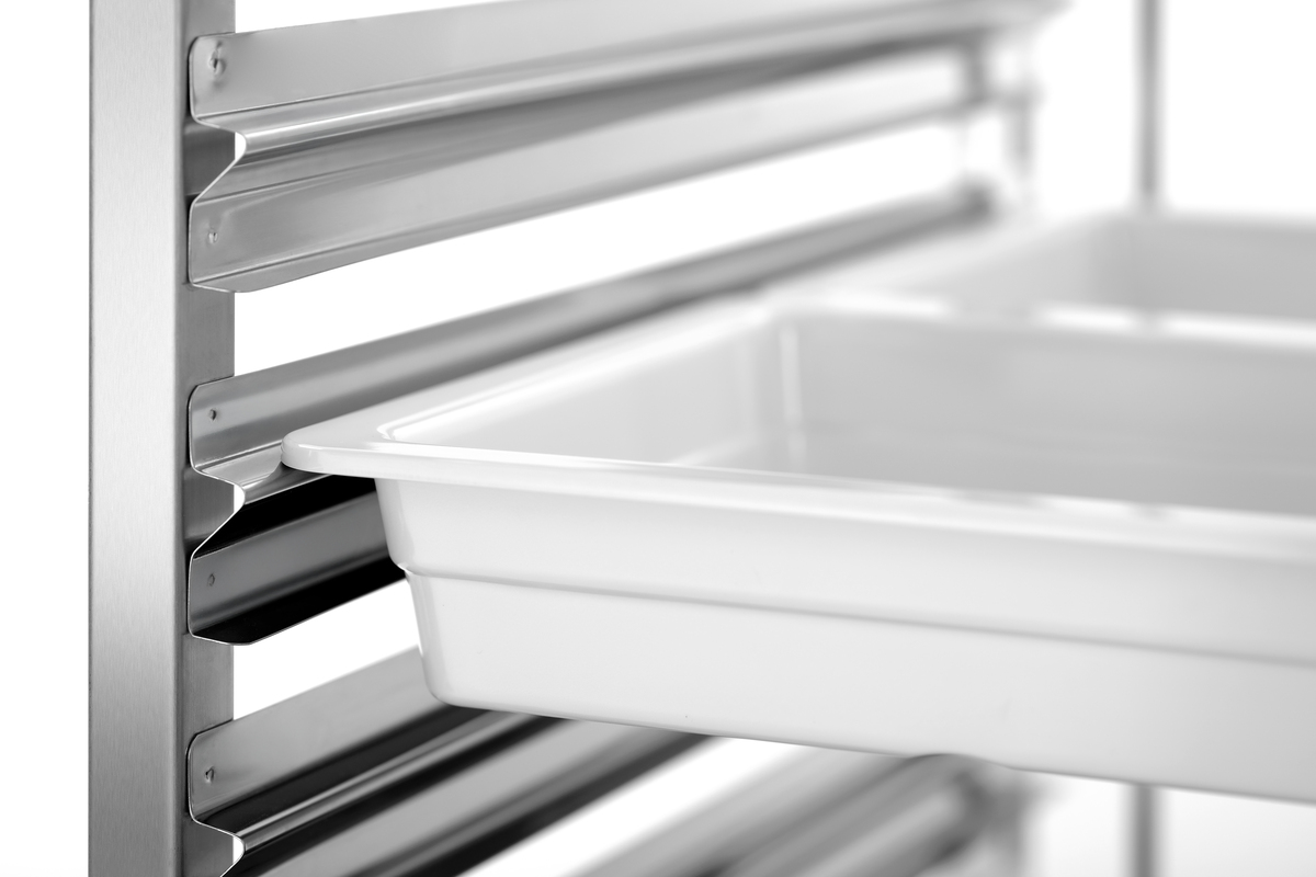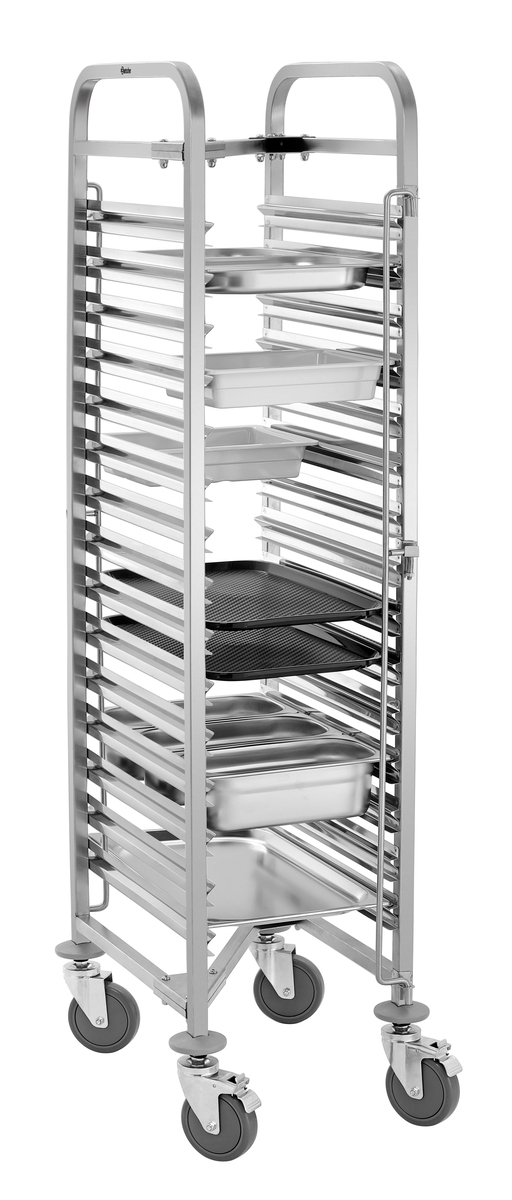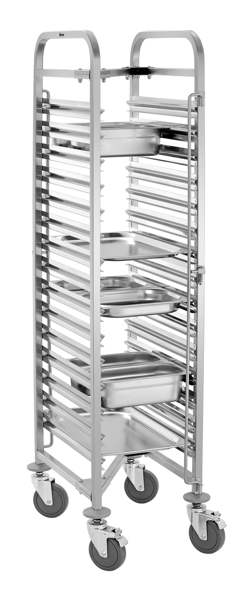 Platzsparend und robust gebaut: Der Regalwagen mit 15 Einschüben im 1/1 GN-Format trägt bis zu 150 kg und lässt sich dank spezieller Bauweise mühelos ineinanderschieben - ideal für eine effiziente Lagerung.