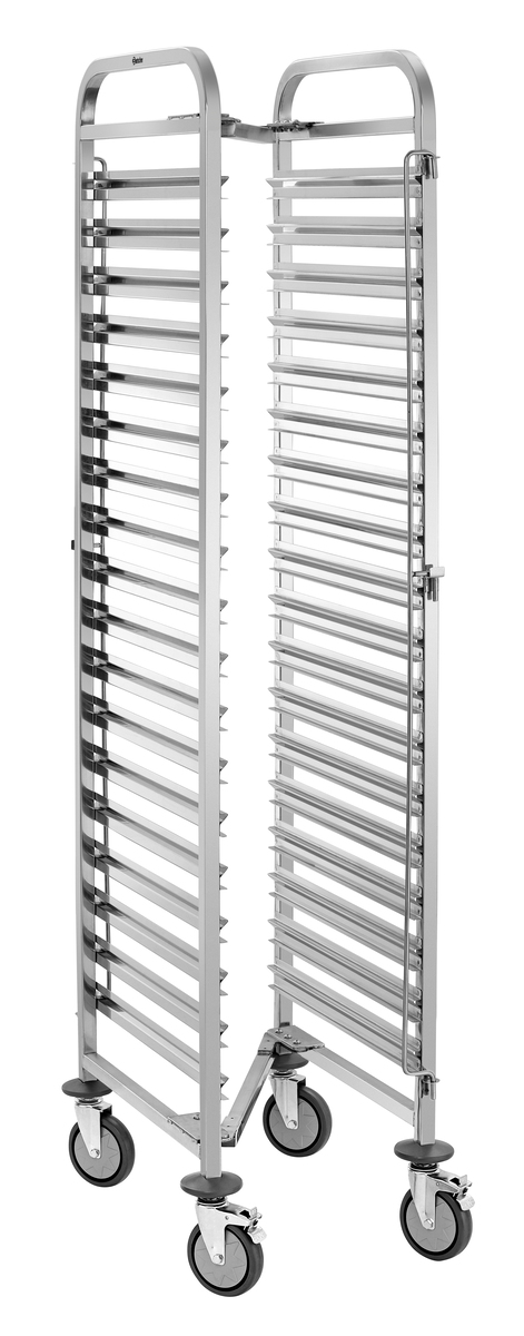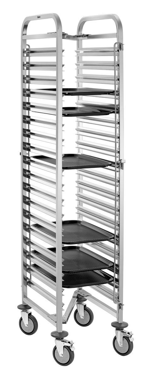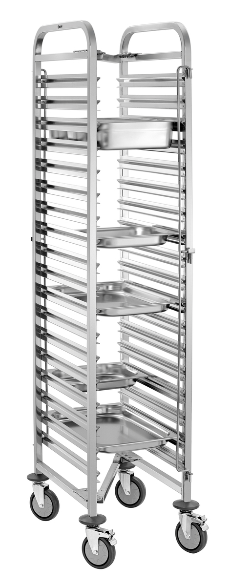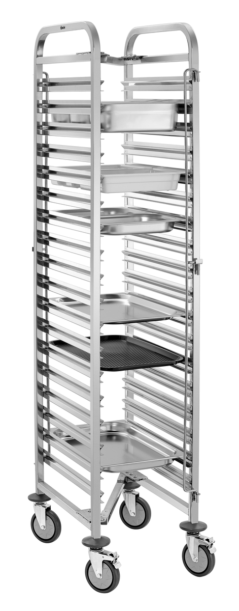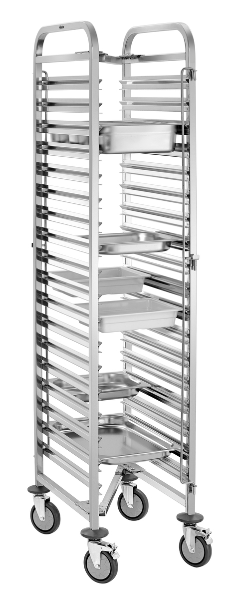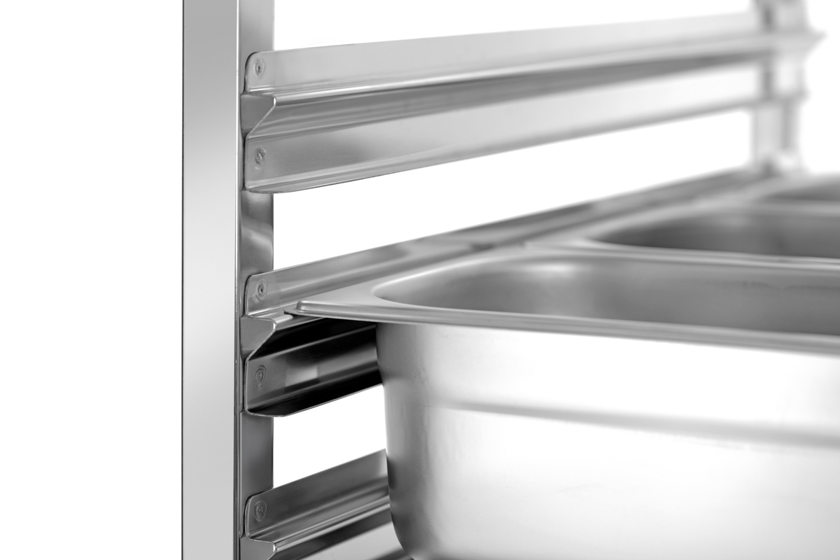 Der Regalwagen mit 18 Einschüben im 1/1 GN-Format bietet großzügigen Stauraum für effiziente Abläufe im Küchenalltag. Die beidseitige Behältersicherung verhindert zuverlässig das Verrutschen der Behälter und sorgt für sicheren Halt beim Transport.