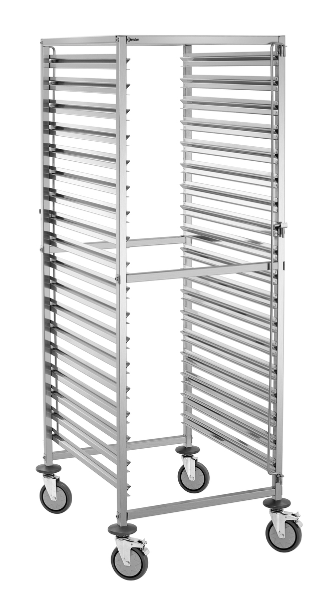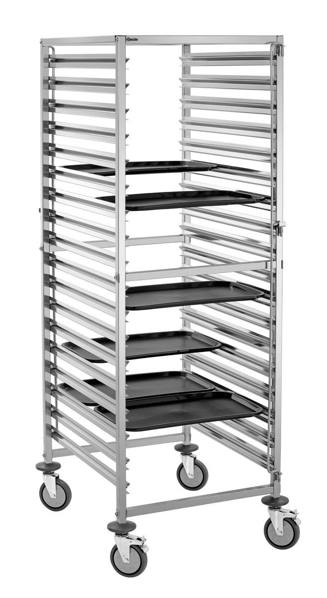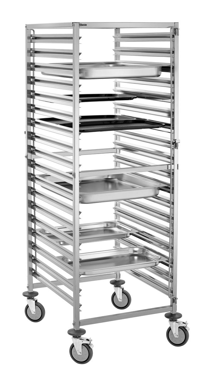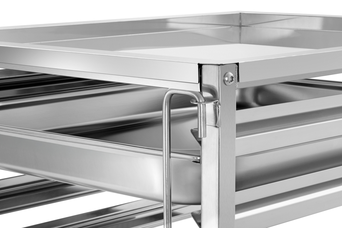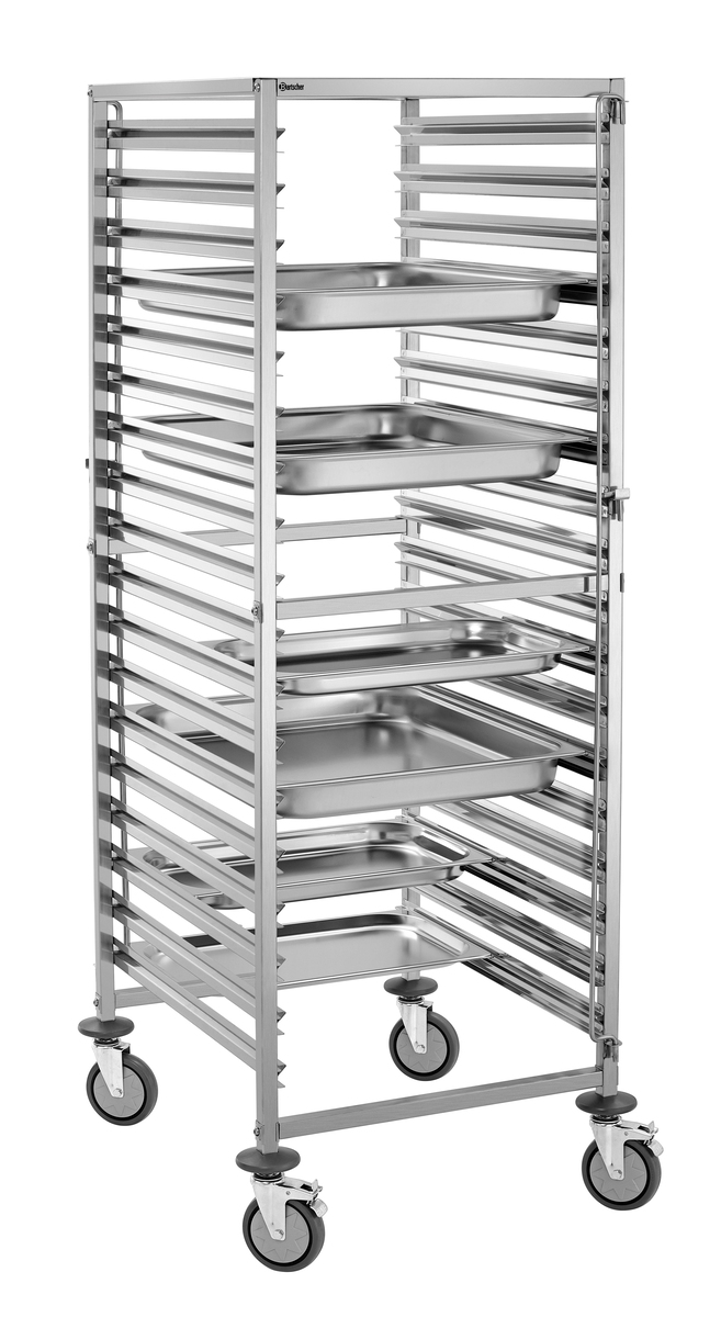 Leicht manövrierbar und durchdacht im Detail: Der Transport mit 18 Einschüben für GN-Behälter, Roste und Bleche bis 2/1 GN gelingt mühelos. Die beidseitige Behältersicherung verhindert zuverlässig das Verrutschen der Behälter und sorgt für sicheren Halt beim Transport.