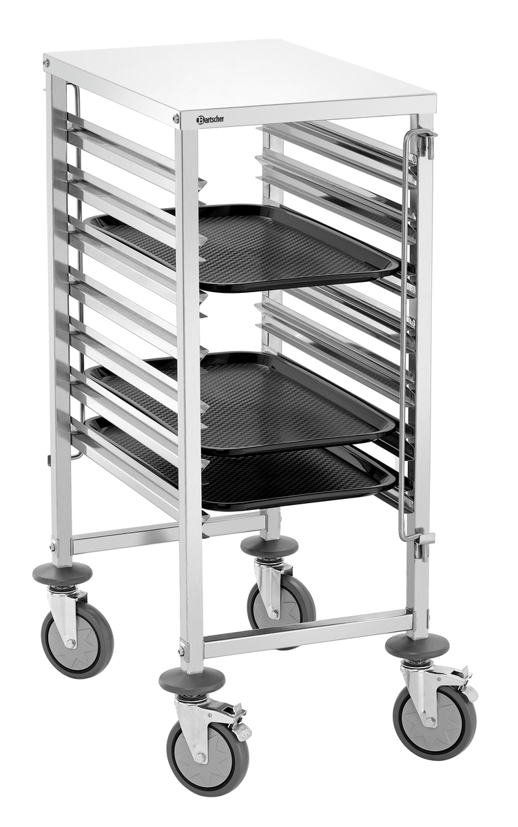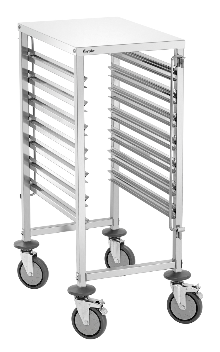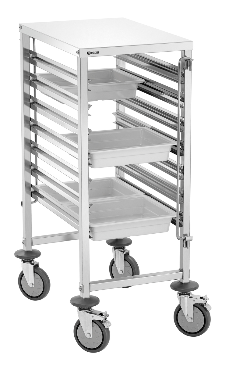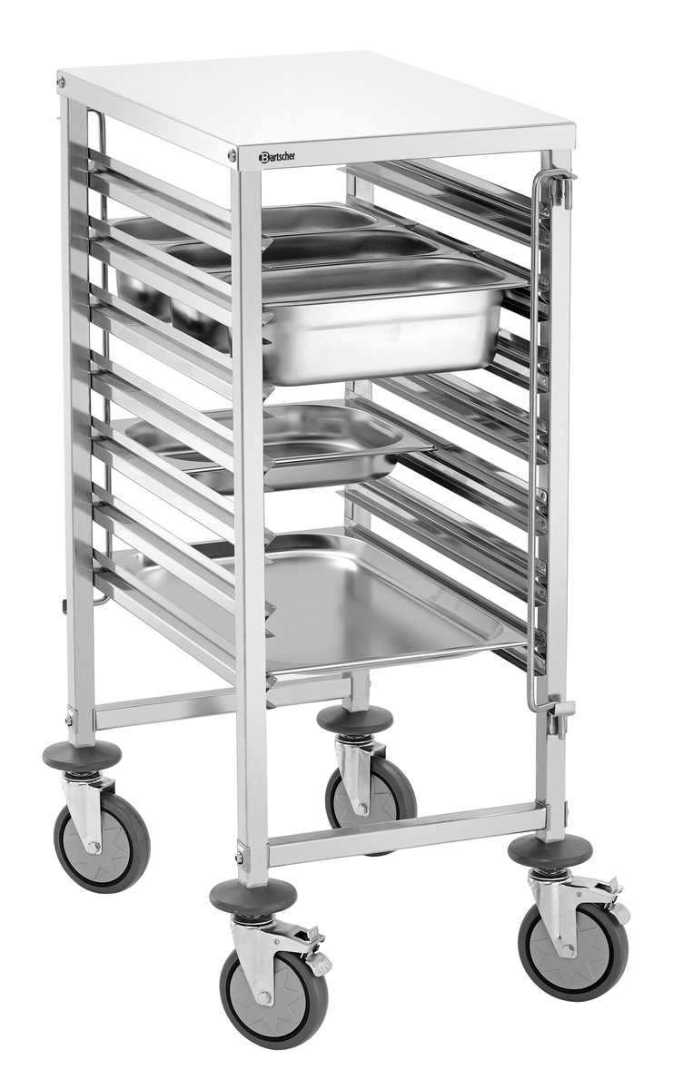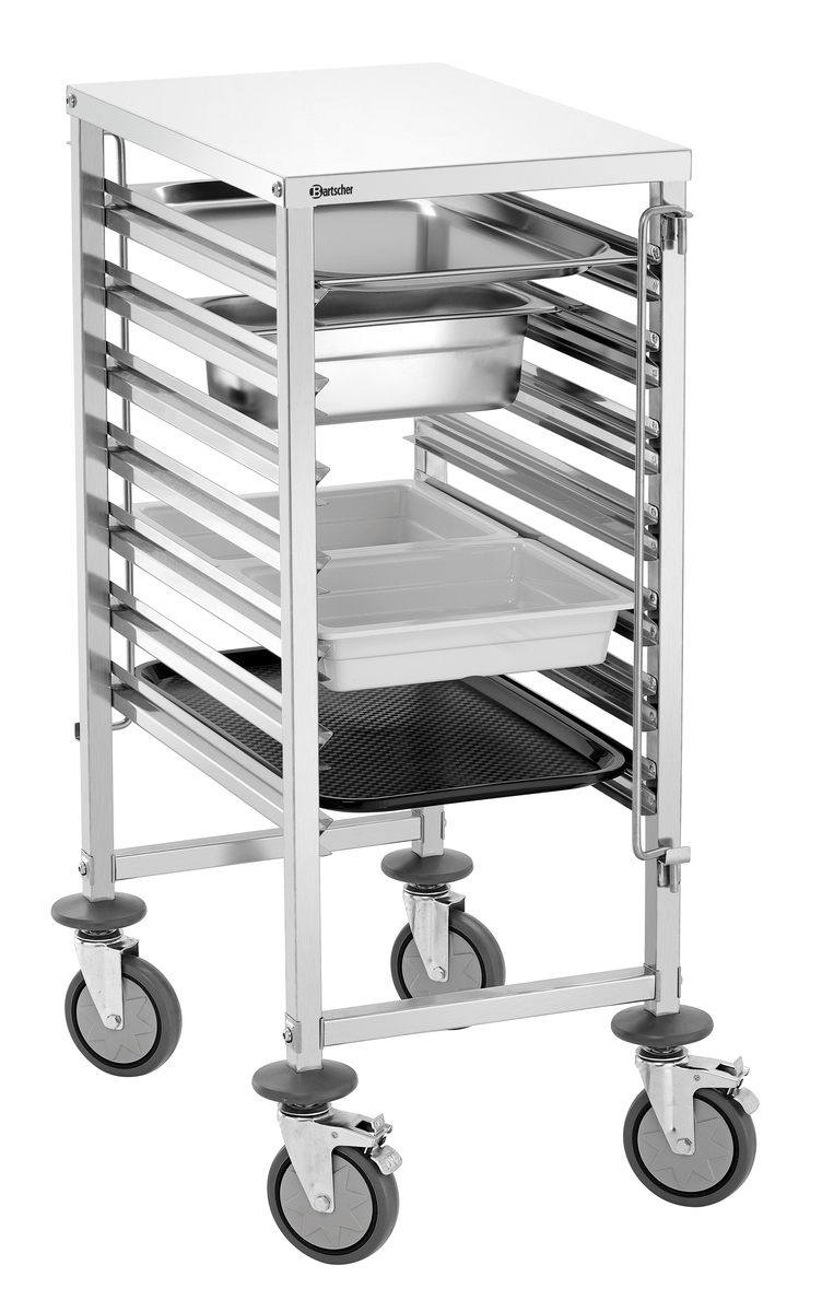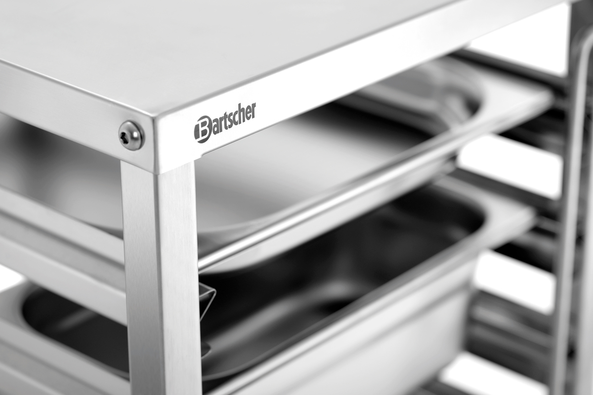 Strukturiertes Arbeiten leicht gemacht - der Regalwagen mit 7 Einschüben im 1/1 GN-Format und zusätzlicher Stellfläche bietet viel Raum für Ordnung. Die beidseitige Behältersicherung verhindert zuverlässig das Verrutschen der Behälter und sorgt für sicheren Halt beim Transport.