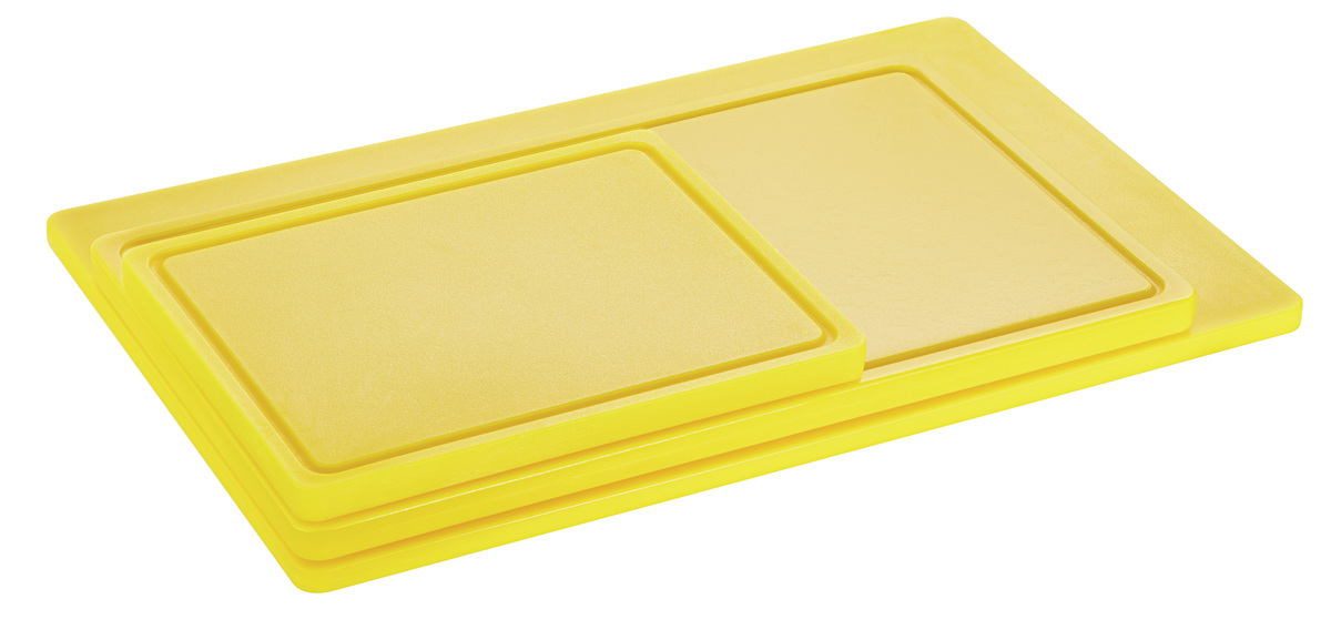 Hygiene im Fokus mit den Schneidbrettern im Format 60 x 40 cm - Verschiedenfarbige Schneidbretter für die unterschiedlichen Lebensmittelgruppen. Das HACCP-konforme gelbe Schneidbrett ist ausgelegt für das Schneiden von Geflügel.
