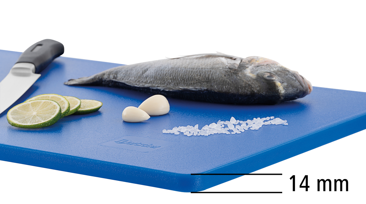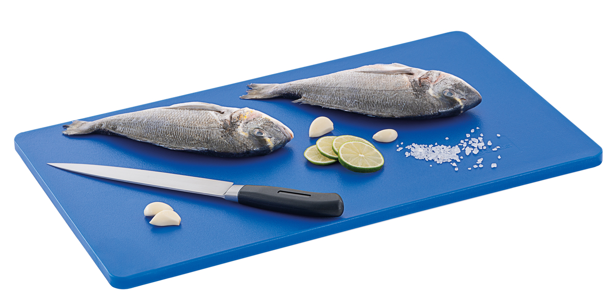Hygiene im Fokus mit den Schneidbrettern im Format 53 × 32 cm - Verschiedenfarbige Schneidbretter für unterschiedliche Lebensmittelgruppen. Das beidseitig nutzbare, HACCP-konforme Schneidbrett in blau - für das Schneiden von Fisch- überzeugt durch seine Langlebigkeit.